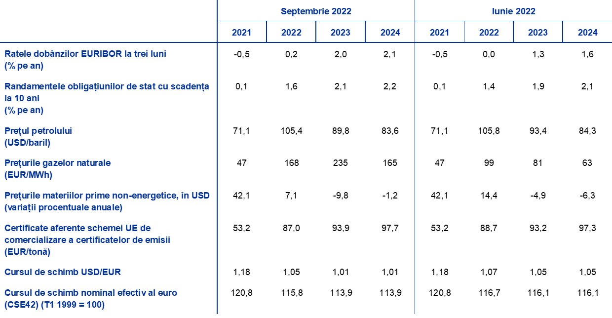 Comparativ cu proiecțiile experților Eurosistemului din luna iunie 2022, ipotezele tehnice includ rate ale dobânzilor mai ridicate, prețuri ușor mai scăzute ale petrolului, prețuri angro semnificativ mai mari ale gazelor naturale și ale energiei electrice, precum și o depreciere a euro. Ipotezele tehnice referitoare la ratele dobânzilor și la prețurile materiilor prime se bazează pe anticipațiile pieței, data-limită pentru includerea ultimelor informații fiind 22 august 2022. Ratele dobânzilor pe termen scurt se referă la EURIBOR la trei luni, anticipațiile pieței fiind derivate din ratele dobânzilor futures. Conform acestei metodologii, ratele dobânzilor pe termen scurt se vor situa, în medie, la 0,2% în 2022, la 2,0% în 2023 și la 2,1% în 2024. Anticipațiile pieței cu privire la randamentele nominale ale obligațiunilor de stat cu scadența la 10 ani din zona euro presupun un nivel mediu anual de 1,6% pentru anul 2022, care va crește progresiv pe parcursul orizontului de proiecție până la 2,2% în 2024.[7] Comparativ cu proiecțiile din luna iunie 2022, anticipațiile pieței privind ratele dobânzilor pe termen scurt au fost revizuite în sens ascendent cu circa 20, 70 și 50 puncte de bază pentru 2022, 2023 și, respectiv, 2024, pe seama așteptărilor referitoare la o înăsprire globală a politicii monetare. Aceasta a condus, de asemenea, la o revizuire în sens ascendent a randamentelor obligațiunilor de stat pe termen lung, cu circa 20 puncte de bază, pe parcursul întregului orizont de proiecție.
