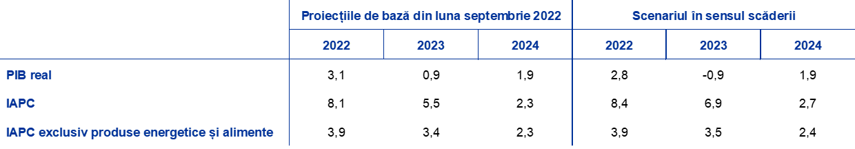 Având în vedere incertitudinile actuale asociate perspectivelor economice pentru zona euro ca urmare a războiului ruso-ucrainean, această casetă prezintă un scenariu în sensul scăderii. Acesta implică o întrerupere completă a livrărilor de gaze naturale din Rusia și de petrol pe cale maritimă în zona euro, existând puține posibilități de acces la surse alternative de aprovizionare cu gaze naturale. De asemenea, acesta presupune o majorare a prețurilor materiilor prime, un grad ridicat de incertitudine, o reducere a schimburilor comerciale și o deteriorare a condițiilor de finanțare comparativ cu proiecția de bază. Prin urmare, activitatea economică ar fi afectată de șocuri nefavorabile mai puternice și ar fi considerabil mai redusă decât în proiecțiile de bază, dinamica PIB pentru anul viitor fiind pronunțat negativă. Inflația ar fi mai ridicată, în special pe termen mediu (Tabelul A).