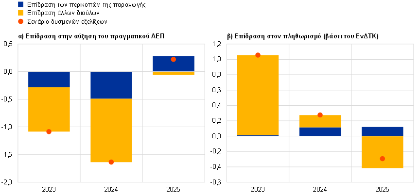 Επίδραση στην αύξηση του πραγματικού ΑΕΠ και στον πληθωρισμό (βάσει του ΕνΔΤΚ) στη ζώνη του ευρώ σύμφωνα με το σενάριο δυσμενών εξελίξεων σε σύγκριση με τις προβολές του βασικού σεναρίου του Δεκεμβρίου 2022