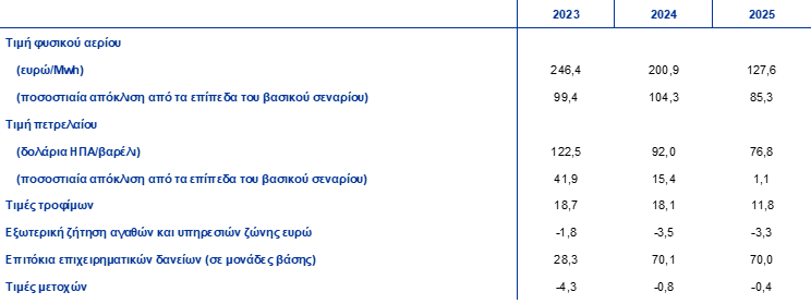 Αυτές οι διαταράξεις του εφοδιασμού θα οδηγήσουν επίσης σε σημαντικές αυξήσεις των τιμών της ενέργειας, ενώ περαιτέρω διαταράξεις στις ουκρανικές εξαγωγές σιτηρών θα προκαλέσουν επίσης εκτίναξη των τιμών των διατροφικών πρώτων υλών. Η πλήρης και μόνιμη διακοπή του εναπομένοντος εφοδιασμού της ΕΕ με ρωσικό φυσικό αέριο, καθώς και η στενότητα που θα παρατηρηθεί στην παγκόσμια αγορά υγροποιημένου φυσικού αερίου (LNG), όταν οι ευρωπαϊκές χώρες θα αναπληρώνουν τα αποθέματα φυσικού αερίου ενόψει του χειμώνα του 2023-24, θα οδηγήσουν τις τιμές του φυσικού αερίου στην κορύφωσή τους στα τέλη του 2023 και στις αρχές του 2024 στα 275 ευρώ ανά MWh, δηλ. στην ανώτατη τιμή του φυσικού αερίου που πρότεινε η Ευρωπαϊκή Επιτροπή τον Νοέμβριο του 2022, η οποία είναι περίπου 125% υψηλότερη από τις υποθέσεις του βασικού σεναρίου (Πίνακας Β). Στη συνέχεια, οι τιμές του φυσικού αερίου θα μειώνονται σταδιακά, καθώς οι δυνατότητες εξαγωγής LNG παγκοσμίως και οι αντίστοιχες δυνατότητες εισαγωγής του στην ΕΕ θα αυξάνονται σταδιακά. Το σενάριο υποθέτει επίσης ότι η Ρωσία έχει περιορισμένη μόνο ικανότητα να ανακατευθύνει σε άλλες χώρες τις εξαγωγές πετρελαίου της, λόγω της απαγόρευσης της ΕΕ για τις ασφαλίσεις που αφορούν τη μεταφορά εξαγωγών πετρελαίου από τη Ρωσία και του ανώτατου ορίου τιμών του πετρελαίου που επέβαλε η Ομάδα G7, με αποτέλεσμα οι τιμές του πετρελαίου να αυξηθούν σε επίπεδο κατά 47% υψηλότερο του βασικού σεναρίου το α΄ τρίμηνο του 2023, αλλά να επανέλθουν στο επίπεδο του βασικού σεναρίου μέχρι τα μέσα του 2025, καθώς η αγορά πετρελαίου θα ανακτά σταδιακά την ισορροπία της. Το σενάριο υποθέτει επίσης κλείσιμο της θαλάσσιας οδού μέσω του Ευξείνου Πόντου και περαιτέρω διαταράξεις στις ουκρανικές εξαγωγές σίτου και αραβοσίτου, καθώς και δευτερογενείς επιδράσεις από την αύξηση του κόστους της ενέργειας και των τιμών των λιπασμάτων, κάτι που θα ωθήσει προς τα άνω τις διεθνείς τιμές των τροφίμων σε σχέση με τις υποθέσεις του βασικού σεναρίου.