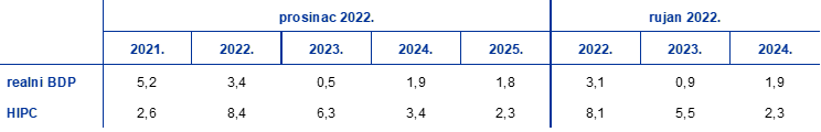 U odnosu na projekcije iz rujna 2022. rast realnog BDP‑a revidiran je naviše za 0,3 postotna boda za 2022., naniže za 0,4 postotna boda za 2023., a za 2024. ostao je nepromijenjen. Revizija naviše za 2022. posljedica je pozitivnih iznenađenja u drugom i trećem tromjesečju zbog snažnijih učinaka ponovnog otvaranja gospodarstva nakon pandemije u odnosu na očekivanja. To je samo djelomično neutralizirano revizijom naniže u posljednjem tromjesečju 2022., koja je posljedica energetske krize i povezane povećane neizvjesnosti, slabljenja pouzdanja i veće inflacije. Ti su čimbenici razlog i za revizije naniže za prva tri tromjesečja 2023. Iako se predviđa se da će se tromjesečni rast BDP‑a početi oporavljati od drugog tromjesečja 2023., smatra se da će dinamika biti sporija nego što se očekivalo u projekcijama iz rujna 2022. To stvara negativan učinak prijenosa, koji u potpunosti poništava snažniju unutargodišnju dinamiku, zbog čega nije došlo do revizije godišnjeg rasta BDP‑a u 2024.