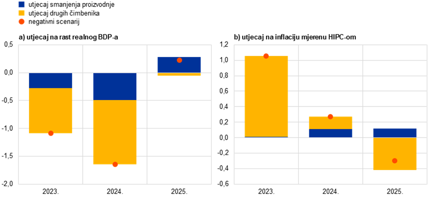 Utjecaj na rast realnog BDP‑a i inflaciju mjerenu HIPC‑om u europodručju prema negativnom scenariju u odnosu na osnovne projekcije iz prosinca 2022.