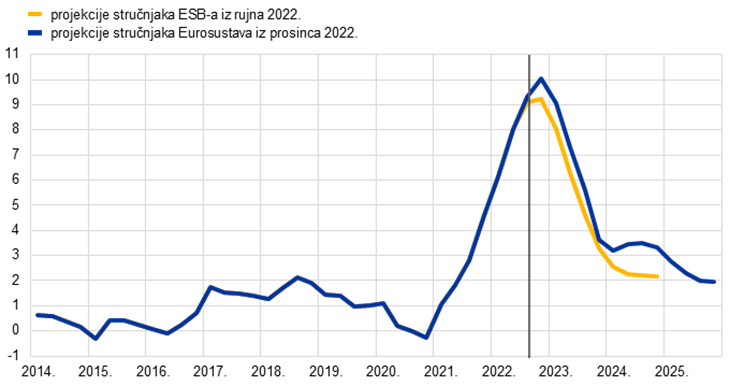 Inflacija je i dalje iznenađujuća visoka u odnosu na projekcije iz rujna 2022. i proširila se na sve komponente HIPC‑a unatoč snažnim smanjenjima veleprodajnih cijena plina i električne energije, slabljenju potražnje, smanjenju problema uskih grla u opskrbnim lancima i državnim mjerama za ograničavanje inflacije cijena energije. Sada se očekuje da će ukupna inflacija mjerena HIPC‑om ostati iznimno visoka u kratkoročnom razdoblju jer se na potrošačke cijene i dalje prenosi utjecaj pritisaka proizvođačkih troškova povezanih s prošlim povećanjima cijena sirovina, prošle deprecijacije eura, manjkova na strani ponude i oštrih uvjeta na tržištima rada. Ipak, očekuje se da će se inflacija smanjiti s prosječnih 8,4 % u 2022. na 6,3 % u 2023., pri čemu će se inflacija smanjiti s 10 % u posljednjem tromjesečju 2022. na 3,6 % u posljednjem tromjesečju 2023. Očekuje se da će se inflacija potom smanjiti na prosječno 3,4 % u 2024. i 2,3 % u 2025. Smanjenje inflacije tijekom projekcijskog razdoblja posljedica je snažnih negativnih baznih učinaka povezanih s energijom tijekom 2023., postupnog učinka normalizacije monetarne politike ESB‑a koja je započela u prosincu 2021., slabijih izgleda za rast i pretpostavljenog pada cijena energenata i prehrambenih sirovina u skladu s terminskim cijenama te pretpostavke da će dugoročnija inflacijska očekivanja ostati usidrena. Očekuje se da će se ukupna inflacija smanjiti na razinu ESB‑ova srednjoročnog inflacijskog cilja od 2 % u drugoj polovici 2025., dok će inflacija mjerena HIPC‑om bez energije i hrane tijekom cijelog projekcijskog razdoblja ostati viša od 2 %. Ta je perzistentnost posljedica odgođenih neizravnih učinaka visokih cijena energije i prošle snažne deprecijacije eura (unatoč nedavnoj blagoj aprecijaciji) te snažnih tržišta rada i učinaka kompenzacije za inflaciju na plaće, za koje se očekuje da će rasti po stopama koje su znatno više od povijesnih nominalnih prosjeka (iako će realni rast ostati ispod razina zabilježenih prije rata u Ukrajini tijekom cijelog projekcijskog razdoblja). U odnosu na projekcije iz rujna 2022. ukupna inflacija revidirana je znatno naviše za 2022. (za 0,3 postotna boda), za 2023. (za 0,8 postotnih bodova) te za 2024. (za 1,1 postotni bod) zbog iznenađujućih vrijednosti novih podataka, ponovne procjene snage i postojanosti pritisaka proizvođačkih troškova te prijenosa njihova učinka, snažnijeg rasta plaća i viših cijena prehrambenih sirovina. Ti pozitivni učinci više su nego neutralizirali negativan učinak pretpostavki o nižim cijenama nafte, plina i električne energije, bržeg rješavanja problema uskih grla u opskrbnim lancima, nedavne aprecijacije eura i slabijih izgleda za rast. Važno je istaknuti da nove fiskalne mjere donesene nakon projekcija iz rujna 2022., koje uglavnom za cilj imaju smanjenje rasta cijena energije u 2023., smanjuju reviziju inflacije naviše za 2023., ali znatno pridonose reviziji naviše za 2024. jer će mnoge mjere biti ukinute.