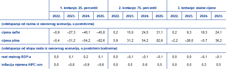 Učinci tih alternativnih kretanja procjenjuju se nizom makroekonomskih modela kojima se stručnjaci Eurosustava i ESB‑a služe u izradi projekcija. Prosječni učinci na rast realnog BDP‑a i inflaciju prema tim modelima prikazani su u tablici u nastavku. Rezultati pokazuju da se najveća odstupanja naviše od projekcija inflacije mjerene HIPC‑om iz osnovnog scenarija odnose na 75. percentil za razdoblje od 2023. do 2025., što upućuje na to da bi inflacija mjerena HIPC‑om mogla biti viša za 0,5 – 0,6 postotnih bodova. Scenarij koji se temelji na kretanju stalnih cijena upućuje na slabije učinke u 2023. i 2024., ali na slično odstupanje naviše za inflaciju mjerenu HIPC‑om u 2025. Nasuprot tome, u scenariju koji se temelji na 25. percentilu inflacija mjerena HIPC‑om bila bi niža za 0,8 – 0,9 postotnih bodova u 2023. i 2024. te za 0,6 postotnih bodova u 2025. Za 75. percentil uz pretpostavku o stalnim cijenama učinak na rast realnog BDP‑a u 2024. i 2025. iznosi –0,1 postotni bod, dok kretanja za 25. percentil upućuju na to da je rast BDP‑a veći za 0,2 postotna boda u 2024. i za 0,1 postotni bod u 2025.