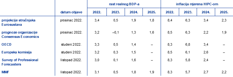 Izvori: Consensus Economics Forecasts, 8. prosinca 2022. (podatci za 2024. i 2025. uzeti su iz ankete iz listopada 2022.); OECD, studeni 2022., Economic Outlook 112, 22. studenoga 2022.; jesenske gospodarske prognoze Europske komisije iz 2022., 11. studenoga 2022; istraživanje ESB‑a Survey of Professional Forecasters za četvrto tromjesečje 2022., 28. listopada 2022.; IMF World Economic Outlook, 11. listopada 2022.