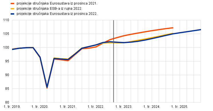 Od druge polovice 2023. gospodarska aktivnost počet će se oporavljati kako se bude ponovno uspostavljala ravnoteža na tržištu energenata, smanjivala neizvjesnost, rješavao problem uskih grla u opskrbnim lancima, povećavao realni dohodak i jačala inozemna potražnja. No BDP zadržat će se na razini koja je vidno niža od onih koje su se očekivale prije rata u Ukrajini (Grafikon 2.). Rast realnog BDP‑a trebao bi ojačati u drugoj polovici 2023. i ostati snažan u 2024. zbog ponovnog uspostavljanja ravnoteže na tržištu energenata, oporavka pouzdanja i smanjenja neizvjesnosti. Smanjenje inflacijskih pritisaka omogućit će oporavak realnog raspoloživog dohotka u uvjetima očekivane otpornosti tržišta rada. Nadalje, očekuje se da će se problem preostalih uskih grla u opskrbnim lancima u potpunosti riješiti do sredine 2023., inozemna potražnja trebala bi se oporaviti i konkurentnost izvoznih cijena u odnosu na glavne trgovinske partnere poboljšati. Očekuje se da će se rast realnog BDP‑a u 2025. blago smanjiti, ali će ostati na razinama iznad povijesnog prosjeka iz razdoblja prije pandemije zbog učinaka dostizanja nakon niza negativnih šokova od početka pandemije. Međutim, razina realnog BDP‑a i dalje će biti vidno niža od razina koje su se očekivale prije godinu dana.