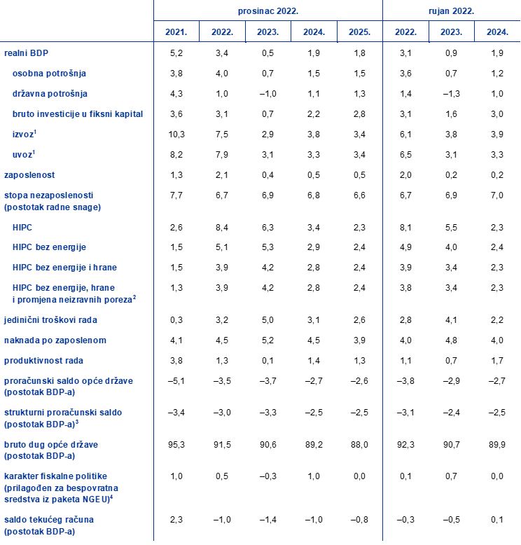 Napomene: Realni BDP i njegove komponente, jedinični troškovi rada, naknada po zaposlenom i produktivnost rada odnose se na sezonski i kalendarski prilagođene podatke. Povijesni podatci mogu se razlikovati od najnovijih Eurostatovih podataka ako su ti podatci objavljeni poslije krajnjeg datuma projekcija.
