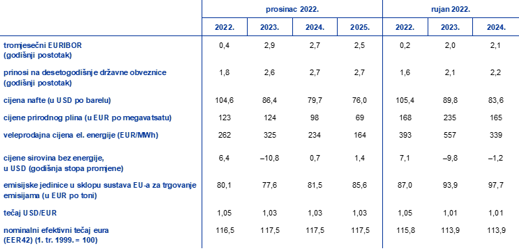 U odnosu na projekcije stručnjaka ESB‑a iz rujna 2022. tehničke pretpostavke uključuju više kamatne stope, niže cijene nafte, znatno niže veleprodajne cijene plina i električne energije te aprecijaciju eura. Tehničke pretpostavke povezane s kamatnim stopama i cijenama sirovina temelje se na tržišnim očekivanjima s krajnjim datumom 23. studenoga 2022. Kratkoročne kamatne stope odnose se na tromjesečni EURIBOR, pri čemu su tržišna očekivanja izvedena iz kamatnih stopa predviđenih ročnicama. Uporabljenom metodologijom izračunano je da će prosječna razina tih kratkoročnih kamatnih stopa iznositi 0,4 % u 2022., 2,9 % u 2023., 2,7 % u 2024. i 2,5 % u 2025. godini. Tržišna očekivanja povezana s nominalnim prinosima na desetogodišnje državne obveznice u europodručju upućuju na prosječnu godišnju razinu od 1,8 % za 2022. te njihov postupan rast tijekom projekcijskog razdoblja do 2,7 % u 2025.[4] U odnosu na projekcije iz rujna 2022. tržišna očekivanja povezana s kratkoročnim kamatnim stopama revidirana su naviše za oko 20 baznih bodova za 2022., za 90 baznih bodova za 2023. i za 60 baznih bodova za 2024. zbog očekivanja da će doći do bržeg ukidanja monetarnih poticaja. Zbog toga su i prinosi na dugoročne državne obveznice tijekom projekcijskog razdoblja revidirani naviše za oko 20 do 50 baznih bodova.