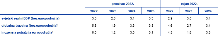 Svjetsko gospodarstvo pogođeno je nepovoljnim čimbenicima koji slabe izglede za globalni rast i inozemnu potražnju europodručja, dok je globalna inflacija i dalje visoka, ali čini se da je već dosegnula najvišu razinu. Rat koji Rusija vodi u Ukrajini i dalje je glavni izvor poremećaja, posebno na tržištima energenata i prehrambenih sirovina, a cijene energenata i dalje su kolebljive unatoč njihovu padu nakon projekcija iz rujna 2022. Nadalje, posebno u zemljama s tržištima u nastajanju, rat potiče neizvjesnost povezanu sa sigurnošću opskrbe hranom. U Kini odluka nadležnih tijela da zasad nastave provoditi strategiju nulte tolerancije na bolest COVID‑19 i recesija u sektoru stambenih nekretnina dodatno nepovoljno utječu na gospodarsku aktivnost. Premda su se ograničenja povezana s pandemijom i problem uskih grla u opskrbnim lancima smanjili na globalnoj razini, veliki i dugotrajni inflacijski pritisci te pooštreni uvjeti financiranja i dalje nepovoljno utječu na raspoloživi dohodak kućanstava.