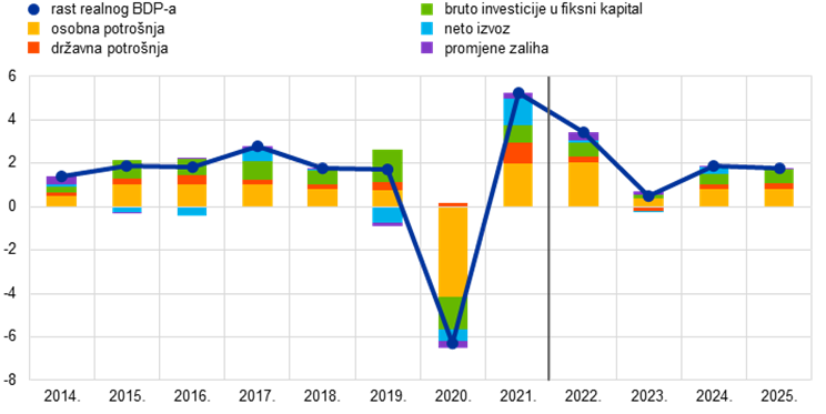 Kada je riječ o sastavnicama BDP‑a, očekuje se da će se rast realne potrošnje kućanstava znatno smanjiti u 2023. te da će se postupno oporavljati u 2024. i 2025. Ukidanje pandemijskih ograničenja povoljno je utjecalo na aktivnost u uslužnom sektoru i osobnu potrošnju tijekom ljetnih mjeseci, ali očekuje se postupno slabljenje tih učinaka tijekom posljednjeg tromjesečja 2022. Šok cijena energije zbog rata u Ukrajini doveo je do povećanja potrošačkih cijena i neizvjesnosti, snažno je pogodio pouzdanje potrošača i negativno utjecao na realne dohotke, što je nepovoljno utjecalo na realnu potrošnju kućanstava i moglo bi prouzročiti smanjenje ukupne potrošnje u kratkoročnom razdoblju. Stoga se očekuje da će se rast potrošnje kućanstava smanjiti s 4,0 % u 2022. na samo 0,7 % u 2023. S obzirom na smanjenje inflacije i pod pretpostavkom smanjenja neizvjesnosti, zajedno s relativno postojanim rastom raspoloživog dohotka, potrošnja će se postupno oporavljati i povećati za 1,5 % u 2024. i 2025.
