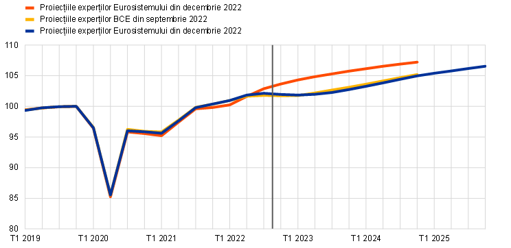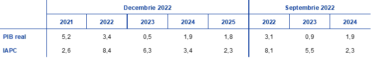 Comparativ cu proiecțiile din luna septembrie 2022, creșterea PIB real a fost revizuită în sens ascendent cu 0,3 puncte procentuale pentru anul 2022 și în sens descendent cu 0,4 puncte procentuale pentru anul 2023 și este nemodificată pentru 2024. Revizuirea în sens ascendent pentru 2022 reflectă rezultatele pozitive peste așteptări din trimestrele II și III, pe seama efectelor mai puternice decât cele anticipate ale redeschiderii postpandemice a economiei. Aceasta a fost numai parțial anulată de revizuirea în sens descendent din trimestrul IV 2022 generată de criza energetică și de incertitudinile ridicate asociate, de scăderea încrederii și de intensificarea inflației. Acești factori explică, de asemenea, revizuirile în sens descendent pentru primele trei trimestre ale anului 2023. Deși dinamica trimestrială a PIB este proiectată să înceapă să se redreseze din trimestrul II 2023, se consideră că ritmul acesteia va fi mai lent decât cel estimat în proiecțiile din luna septembrie 2022, ceea ce creează un efect de report negativ, care anulează complet dinamica mai robustă din cursul anului, conducând la absența unei revizuiri a creșterii anuale a PIB în 2024.
