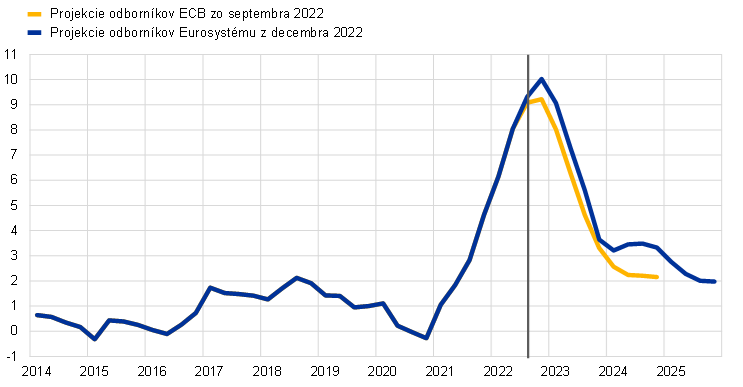 V porovnaní s projekciami zo septembra 2022 inflácia dosahuje nečakane vysoké hodnoty a dotýka sa už všetkých zložiek HICP, a to i napriek prudkému poklesu veľkoobchodných cien plynu a elektriny, slabnúcemu dopytu, uvoľňovaniu ponukových obmedzení a vládnym opatreniam na tlmenie inflácie cien energií. Vzhľadom na pokračujúce premietanie cenových tlakov súvisiacich s predchádzajúcim rastom cien komodít, predchádzajúcim oslabovaním eura, ponukovými obmedzeniami a nedostatkom pracovných síl do spotrebiteľských cien sa momentálne očakáva, že celková inflácia HICP zostane v krátkodobom horizonte na mimoriadne vysokej úrovni. Inflácia však má klesnúť z priemerných 8,4 % v roku 2022 na 6,3 % v roku 2023 – z 10 % v poslednom štvrťroku 2022 na 3,6 % v poslednom štvrťroku 2023. Následne by sa mala znížiť na 3,4 % v roku 2024 a 2,3 % v roku 2025. Pokles inflácie počas sledovaného obdobia je odrazom výrazných tlmiacich bázických efektov cien energií počas roka 2023, postupného vplyvu normalizácie menovej politiky ECB, ktorá sa začala v decembri 2021, slabšieho výhľadu hospodárskeho rastu a predpokladaného poklesu cien energií a potravinových komodít v súlade s cenami futures, ako aj predpokladu, že dlhodobejšie inflačné očakávania zostanú ukotvené. Celková inflácia by mala v druhom polroku 2025 klesnúť na úroveň strednodobého inflačného cieľa ECB, t. j. 2 %, zatiaľ čo inflácia HICP bez energií a potravín zostane počas sledovaného obdobia nad úrovňou 2 %. Pretrvávanie jej zvýšenej úrovne je spôsobené oneskorenými nepriamymi účinkami vysokých cien energií a prudkým znehodnotením eura v minulosti (napriek jeho nedávnemu miernemu zhodnoteniu), ako aj silným trhom práce a pôsobením kompenzácie inflácie na mzdy. Tie by mali rásť tempom, ktoré v nominálnom vyjadrení výrazne prekračuje historické priemery (hoci v reálnom vyjadrení zostáva počas celého sledovaného obdobia pod úrovňou zaznamenanou pred vojnou na Ukrajine). V porovnaní s projekciami zo septembra 2022 bola celková inflácia výrazne upravená nahor na rok 2022 (o 0,3 percentuálneho bodu), 2023 (o 0,8 percentuálneho bodu) i 2024 (o 1,1 percentuálneho bodu), a to v dôsledku aktuálnych nečakane vysokých údajov, prehodnotenia intenzity a pretrvávania cenových tlakov a ich šírenia, rýchlejšieho rastu miezd a vyšších cien potravinových komodít. Tieto rastové účinky prevažujú tlmiaci účinok nižších predpokladaných cien ropy, plynu a elektriny, rýchlejšieho uvoľňovania ponukových obmedzení, nedávneho zhodnocovania eura a vyhliadok slabšieho hospodárskeho rastu. Je dôležité poznamenať, že nové rozpočtové opatrenia, o ktorých bolo rozhodnuté od septembrových projekcií a ktoré sú väčšinou zamerané na zníženie rastu cien energií v roku 2023, majú za následok miernejšiu revíziu inflácie na rok 2023 nahor, zatiaľ čo v prípade roka 2024 ukončenie mnohých opatrení k revízii inflácie nahor výrazne prispieva.