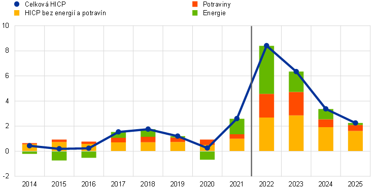 Inflácia HICP by mala v roku 2022 dosiahnuť v priemere 8,4 %, v roku 2023 by mala klesnúť na 6,3 % a v roku 2025 na 2,3 %. V tomto profile celkovej inflácie sa v rôznej miere odráža pokles ročnej miery zmeny všetkých hlavných zložiek (graf 6). V priebehu roka 2023 dôjde predovšetkým k prudkému poklesu inflácie cien energií, ktorý významne prispeje k poklesu celkovej inflácie z 10 % na konci roka 2022 na 3,6 % v poslednom štvrťroku 2023. Napriek tomu však zostane dôležitým faktorom toho, že celková inflácia bude v roku 2024 výrazne nad úrovňou inflačného cieľa ECB.