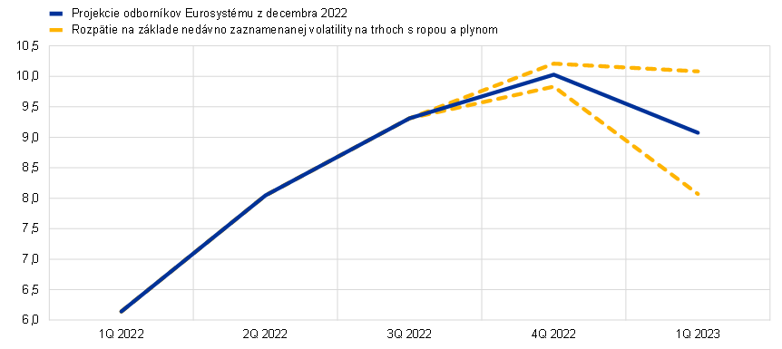 Súčasná vysoká volatilita cien ropy a najmä plynu výrazne zvýšila neistotu spojenú s výhľadom inflácie vo veľmi krátkodobom horizonte. Takáto výrazná krátkodobá volatilita zvyčajne nie je zachytená v distribúcii odvodenej z opcií okolo cien futures (viac informácií nižšie). Na posúdenie takejto krátkodobej citlivosti je možné posudzovať horný a dolný interval krátkodobých výkyvov cien ropy a plynu a následne na základe tohto intervalu odvodiť prognózy vývoja inflácie v blízkej budúcnosti. V tejto analýze citlivosti je pre ropu stanovený interval od 60 do 120 USD za barel a pre veľkoobchodné ceny plynu od 50 EUR do 200 EUR za MWh. Tieto ceny, ktoré sa považujú za stabilné v období od decembra 2022 do marca 2023, sa zadávajú do súboru energetických rovníc (pre pohonné hmoty, elektrinu a plyn), ktoré odborníci ECB používajú pri prognózovaní krátkodobej inflácie. Predpokladaný maximálny rast cien ropy a plynu by v porovnaní so základnými projekciami mal celkovú infláciu HICP v poslednom štvrťroku 2022 zvýšiť o 0,2 percentuálneho bodu a v prvom štvrťroku 2023 o 1,0 percentuálneho bodu. Predpokladaný maximálny pokles cien ropy a plynu by mal symetrický účinok a celkovú infláciu by v poslednom štvrťroku 2022 znížil o 0,2 percentuálneho bodu a v prvom štvrťroku 2023 o 1,0 percentuálneho bodu.