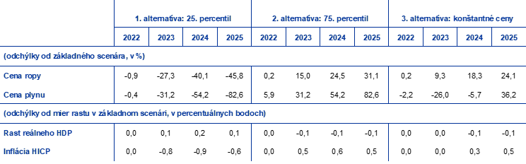 Vplyv alternatívneho vývoja sa hodnotí prostredníctvom súboru makroekonomických modelov odborníkov Eurosystému a ECB používaných v projekciách. Priemerný vplyv na rast reálneho HDP a infláciu podľa týchto modelov je uvedený v tabuľke nižšie. Výsledky ukazujú, že najvyššie odchýlky smerom nahor od základných projekcií inflácie HICP sa týkajú 75. percentilu na roky 2023 – 2025, z čoho vyplýva, že inflácia HICP by mohla byť vyššia o 0,5 až 0,6 percentuálneho bodu. Scenár založený na konštantnom vývoji cien naznačuje menšie vplyvy v rokoch 2023 – 2024, ale podobnú hornú odchýlku inflácie HICP v roku 2025. Naopak, v scenári založenom na 25. percentile by bola inflácia HICP nižšia o 0,8 – 0,9 percentuálneho bodu v rokoch 2023 – 2024 a o 0,6 percentuálneho bodu v roku 2025. Vplyv na rast reálneho HDP je ‑0,1 percentuálneho bodu v rokoch 2024 aj 2025, pokiaľ ide o 75. percentil a predpoklad konštantných cien, zatiaľ čo 25. percentil by znamenal vyšší rast o 0,2 percentuálneho bodu v roku 2023 a 0,1 percentuálneho bodu v roku 2025.