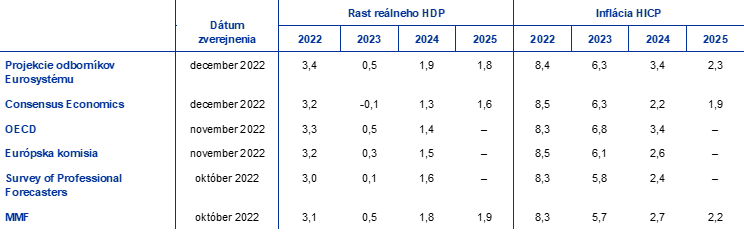 Zdroj: Consensus Economics Forecasts, 8. decembra 2022 (údaje na rok 2024 a 2025 pochádzajú z prieskumu z októbra 2022); OECD November 2022 Economic Outlook 112, 22. novembra 2022; European Commission Autumn 2022 Economic Forecast, 11. novembra 2022; ECB Survey of Professional Forecasters, za posledný štvrťrok 2022, 28. októbra 2022; IMF World Economic Outlook, 11. októbra 2022.