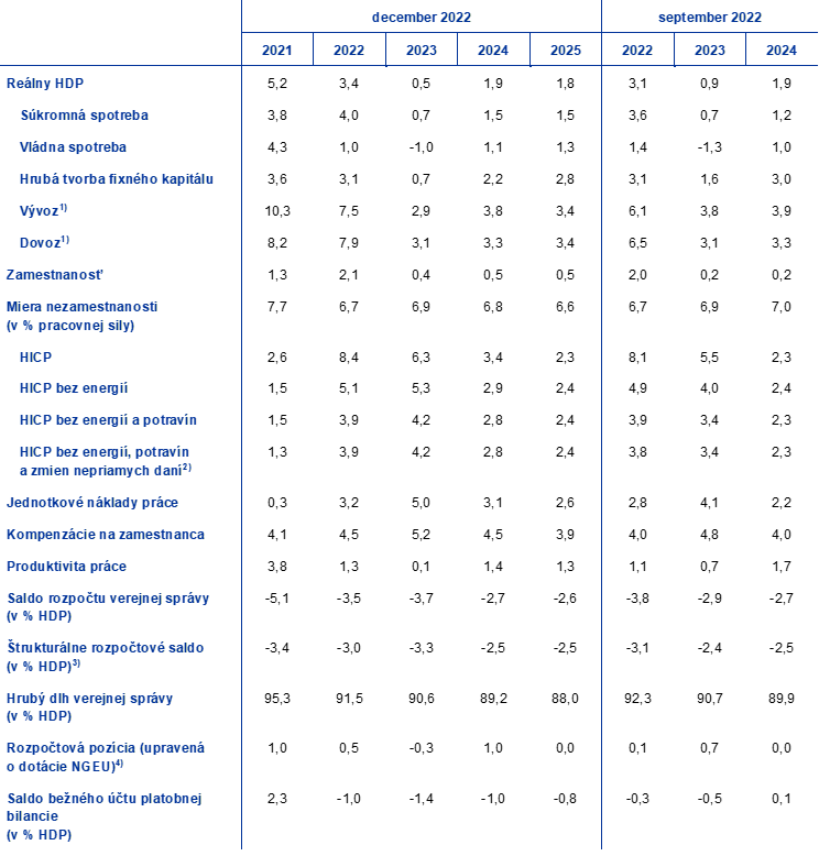 V porovnaní s projekciami zo septembra 2022 bol rast reálneho HDP upravený nahor o 0,3 percentuálneho bodu na rok 2022 a o 0,4 percentuálneho bodu na rok 2023, zatiaľ čo na rok 2024 zostáva nezmenený. Revízia smerom nahor na rok 2022 je odrazom nečakane priaznivých výsledkov v druhom a treťom štvrťroku v dôsledku výraznejších než očakávaných účinkov znovuotvorenia hospodárstva po pandémii. To bolo len čiastočne neutralizované revíziou smerom nadol v poslednom štvrťroku 2022 v dôsledku energetickej krízy a s tým spojenej zvýšenej neistoty, klesajúcej dôvery a vyššej inflácie. Tieto faktory tiež vysvetľujú úpravu smerom nadol na prvé tri štvrťroky 2023. Hoci sa predpokladá, že štvrťročný rast HDP sa od druhého štvrťroka 2023 začne zotavovať, jeho tempo by malo byť pomalšie, než sa očakávalo v projekciách zo septembra 2022. To vedie k negatívnemu prenosovému efektu, ktorý v plnej miere kompenzuje silnejšiu vnútroročnú dynamiku, čoho výsledkom je nezmenená projekcia ročného rastu HDP v roku 2024.
