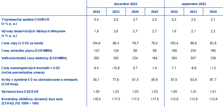 V porovnaní s projekciami odborníkov ECB zo septembra 2022 technické predpoklady zahŕňajú vyššie úrokové miery, nižšie ceny ropy, výrazne nižšie veľkoobchodné ceny plynu a elektrickej energie a zhodnocovanie eura. Technické predpoklady týkajúce sa úrokových mier a cien komodít vychádzajú z očakávaní trhu ku dňu uzávierky 23. novembra 2022. Krátkodobé úrokové miery vychádzajú z trojmesačnej sadzby EURIBOR, pričom trhové očakávania sú odvodené z úrokových mier futures. Na základe tejto metodiky by mala priemerná úroveň krátkodobých úrokových mier dosiahnuť 0,4 % v roku 2022, 2,9 % v roku 2023, 2,7 % v roku 2024 a 2,5 % v roku 2025. Nominálne výnosy desaťročných štátnych dlhopisov v eurozóne by podľa očakávaní trhu mali dosiahnuť v priemere 1,8 % v roku 2022 a počas projektovaného obdobia by sa mali postupne zvýšiť na 2,7 % v roku 2025.[4] V porovnaní s projekciami zo septembra 2022 sa trhové očakávania krátkodobých úrokových mier zvýšili o približne 20 bázických bodov na rok 2022, 90 bázických bodov na rok 2023 a 60 bázických bodov na rok 2024, a to vzhľadom na očakávania rýchlejšieho ukončenia menovopolitických stimulov. To zároveň viedlo k revízii výnosov dlhodobých štátnych dlhopisov počas sledovaného obdobia smerom nahor o približne 20 až 50 bázických bodov.