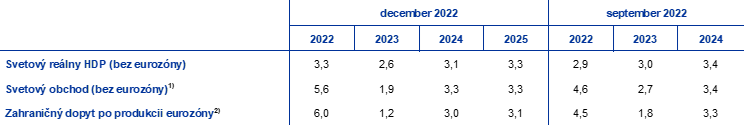 V dôsledku slabšej svetovej hospodárskej aktivity sa zhoršil aj výhľad vývoja zahraničného dopytu po produkcii eurozóny. Svetový obchod sa v druhom štvrťroku 2022 zmiernil v dôsledku slabnúcej výrobnej aktivity a pretrvávajúcich ponukových obmedzení, ktoré sa zintenzívnili v dôsledku ruskej agresie voči Ukrajine. Očakáva sa, že v druhom polroku bol obchod vzhľadom na pretrvávajúce nepriaznivé vplyvy, napriek určitému slabnutiu globálnych ponukových obmedzení, naďalej slabý. V porovnaní s projekciami zo septembra 2022 bol výhľad vývoja svetového obchodu (bez eurozóny) a zahraničného dopytu po produkcii eurozóny na rok 2022 upravený nahor, a to vďaka výraznejšej dynamike obchodu vo vyspelých ekonomikách, najmä v európskych krajinách nepatriacich do eurozóny, než sa pôvodne očakávalo. Zahraničný dopyt po produkcii eurozóny bol na neskoršie roky sledovaného obdobia upravený nadol, v súlade s očakávaným slabším hospodárskym rastom.