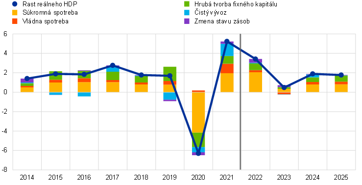 Poznámky: Údaje sú očistené od sezónnych vplyvov a rozdielov v počte pracovných dní. Historické údaje sa môžu líšiť od najnovších publikácií Eurostatu vydaných po uzávierke projekcií. Zvislá čiara označuje začiatok aktuálne projektovaného obdobia.
