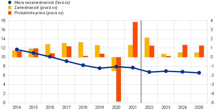 Podľa projekcií by mal trh práce v krátkodobom horizonte zostať odolný a neskôr by mal vo všeobecnosti zodpovedať vývoju hospodárskej aktivity (graf č. 4). Po výraznom zrýchlení v roku 2022 by sa mal rast zamestnanosti v roku 2023 výrazne spomaliť v dôsledku nižšieho dopytu po pracovnej sile pri spomaľovaní hospodárskeho rastu. Z krátkodobého hľadiska sa očakáva, že podniky budú krátiť pracovný čas a vzhľadom na stále výrazný nedostatok pracovných síl si zachovajú stav personálu. Od roku 2024 má zamestnanosť celkovo držať krok s predpokladaným zlepšením hospodárskej aktivity. V súlade s tým sa očakáva prudký pokles rastu produktivity na zamestnanú osobu z 1,3 % v roku 2022 na 0,1 % v roku 2023. V roku 2024 by mala vzrásť na 1,4 % a v roku 2025 by mala dosahovať 1,3 %. Predpokladá sa, že miera nezamestnanosti v roku 2023 vzrastie na 6,9 % a potom bude nepretržite klesať až na 6,6 % v roku 2025.