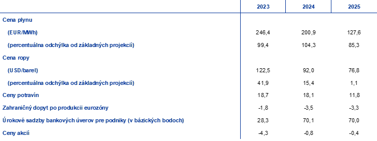 Z pohľadu celého sledovaného obdobia alternatívy vývoja cien energií vychádzajú z cien ropy odvodených z opcií, nedávnych chýb prognóz cien plynových futures a konštantného vývoja cien. Alternatívy pomalšieho a rýchlejšieho vývoja vychádzajú z 25. a 75. percentilu neutrálnych hustôt odvodených z cien ropných opcií 23. novembra 2022 (deň uzávierky technických predpokladov). Toto rozdelenie poukazuje na určitý sklon smerom nadol. Keďže v prípade cien plynu podobné rozdelenie neexistuje, alternatívy vývoja boli odvodené z 25. a 75. percentilu rozdelenia na základe nedávnych chýb prognóz cien plynových futures. Do úvahy sa tiež berie predpoklad konštantnej ceny tak pre ceny ropy, ako aj pre ceny plynu.