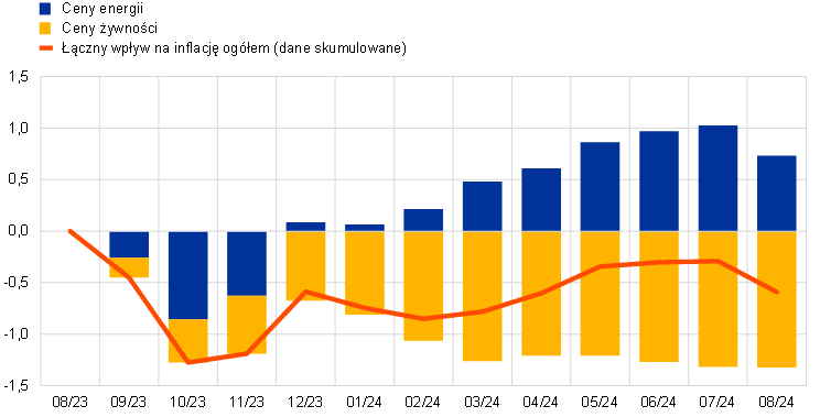 Uwagi: Skumulowany wpływ efektu bazy w każdym przypadku przedstawiono w stosunku do określonego miesiąca odniesienia. Na przykład efekt bazy związany z cenami energii oznaczałby wzrost inflacji HICP ogółem w czerwcu 2024 o 1,0 pkt proc. w porównaniu ze stopą inflacji w sierpniu 2023. Podobnie spadek inflacji HICP ogółem w czerwcu 2024 o 1,3 pkt proc. w porównaniu z sierpniem 2023 jest powodowany efektem bazy dotyczącym składowej „żywność”. W sumie efekt bazy związany z cenami żywności i energii przyczynia się do obniżenia inflacji HICP ogółem w czerwcu 2024 o 0,3 pkt proc. w porównaniu z sierpniem 2023.
