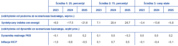Biorąc pod uwagę dużą niepewność co do kształtowania się przyszłych cen energii, wyprowadza się alternatywne ścieżki cen energii na podstawie cen ropy i gazu wynikających z notowań opcji oraz założenia ceny stałej, żeby ocenić wpływ tych alternatywnych ścieżek na perspektywy inflacji HICP i dynamiki realnego PKB. W tej analizie stosuje się syntetyczny indeks cen energii, który obejmuje ceny terminowe zarówno ropy, jak i gazu. Alternatywne ścieżki spadku i wzrostu zostały wyprowadzone z 25. percentyla i 75. percentyla rozkładu gęstości cen ropy i gazu wynikającego z notowań opcji (przy założeniu neutralności względem ryzyka) na 22 sierpnia 2023, czyli datę graniczną dla założeń technicznych. Oba rozkłady wskazują na ryzyka wzrostowe w odniesieniu do założeń technicznych zawartych w projekcjach z września 2023. Ryzyka te są szczególnie wyraźne w przypadku cen terminowych gazu ze względu na wciąż napiętą i niestabilną sytuację na rynku gazu z powodu wojny w Ukrainie. Dodatkowo w odniesieniu do cen zarówno ropy, jak i gazu analizuje się założenie ceny stałej. Skutki tych alternatywnych ścieżek ocenia się przy użyciu różnych modeli makroekonomicznych stosowanych przez ekspertów EBC i Eurosystemu przy sporządzaniu projekcji. W poniższej tabeli przedstawiono w ujęciu średnim skutki dla dynamiki realnego PKB i inflacji HICP uzyskane w tych modelach.
