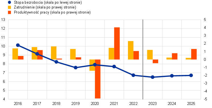 Uwagi: Dane odsezonowane i wyrównane dniami roboczymi. Dane historyczne mogą się różnić od najnowszych danych Eurostatu, których publikacja przypadła po dacie granicznej projekcji. Pionowa linia wyznacza początek horyzontu projekcji.