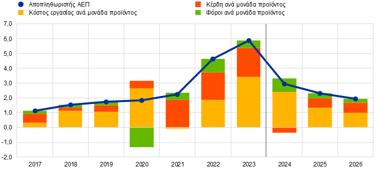 Για περισσότερες πληροφορίες σχετικά με την ανάλυση του αποπληθωριστή του ΑΕΠ και τον ρόλο των κερδών ανά μονάδα προϊόντος στην ανάλυση του πληθωρισμού, βλ. το πλαίσιο της E. Hahn με τίτλο «Ποια ήταν η συμβολή του κέρδους ανά μονάδα προϊόντος στην πρόσφατη ενίσχυση των εγχώριων πιέσεων επί των τιμών στη ζώνη του ευρώ;», Οικονομικό Δελτίο, Τεύχος 4, ΕΚΤ, 2023, καθώς και Arce, O., Hahn, E. and Koester, G., «How tit-for-tat inflation can make everyone poorer», Ιστολόγιο της ΕΚΤ, 30 Μαρτίου 2023.