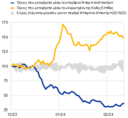 Σημειώσεις: Στο γράφημα α), οι όγκοι διαμετακομιστικού εμπορίου μέσω θαλάσσης υπολογίζονται ως μέσοι όροι για κυλιόμενο διάστημα επτά ημερών, όπου το εύρος ελάχιστου-μέγιστου αναφέρει την ιστορική εξέλιξη του μεγέθους από το 2019 έως το 2022 με βάση το επίπεδο που καταγράφεται την 1η Δεκεμβρίου κάθε δεδομένου έτους. Στο γράφημα β), η ένδειξη «ανακ. BP» αναφέρεται στην ανακοίνωση της British Petroleum ότι θα αναστείλει τις μεταφορές μέσω της Ερυθράς Θάλασσας. Στο γράφημα δ), χρησιμοποιείται μια αντεστραμμένη κλίμακα, όπου οι μικρότεροι χρόνοι παράδοσης των προμηθευτών (PMI) καταγράφηκαν τον Απρίλιο του 2022 για τα παγκόσμια στοιχεία (εκτός της ζώνης του ευρώ), τον Ιούλιο του 2021 για τις ΗΠΑ, τον Μάιο του 2021 για τη ζώνη του ευρώ και τον Απρίλιο του 2020 τόσο για την Κίνα όσο και για το Ηνωμένο Βασίλειο. Πιο πρόσφατες παρατηρήσεις: 11 Φεβρουαρίου 2024 (όγκοι διαμετακομιστικού εμπορίου μέσω θαλάσσης), 26 Φεβρουαρίου 2024 (τιμές πετρελαίου και δείκτης μεταβλητότητας VIX) και 23 Φεβρουαρίου 2024 (τιμές θαλάσσιων μεταφορών).