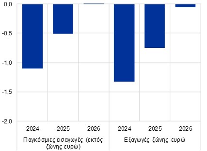 Το εμπόριο της ζώνης του ευρώ αναμένεται να βελτιωθεί, αν και θα παραμείνει υποτονικό με βάση τα ιστορικά δεδομένα. Οι πραγματικές εξαγωγές της ζώνης του ευρώ συνέχισαν να υποχωρούν το γ΄ τρίμηνο του 2023, αλλά εκτιμάται ότι ανέκαμψαν το δ΄ τρίμηνο. Αναμένεται να αυξηθούν στη διάρκεια του χρονικού ορίζοντα προβολής συμβαδίζοντας σε γενικές γραμμές με τις εξελίξεις στην εξωτερική ζήτηση. Σημειώνεται σχετικά ότι η πρόβλεψη του βασικού σεναρίου δεν περιλαμβάνει σημαντικές επιδράσεις από τις διαταράξεις στην Ερυθρά Θάλασσα οι οποίες αναμένεται να είναι βραχύβιες (βλ. Πλαίσιο 2 σχετικά με το βασικό σενάριο και το Πλαίσιο 3 σχετικά με ένα σενάριο που υποθέτει κλιμάκωση των διαταράξεων). Σε σύγκριση με τις προβολές του Δεκεμβρίου 2023, το εξαγωγικό μερίδιο της ζώνης του ευρώ είναι κάπως υψηλότερο στη διάρκεια του χρονικού ορίζοντα προβολής. Ωστόσο, αναμένεται να παραμείνει πολύ χαμηλότερα από τα προ της πανδημίας επίπεδα λόγω των προκλήσεων ανταγωνιστικότητας που σχετίζονται με την προηγούμενη ανατίμηση του ευρώ και με τις προηγούμενες διαταραχές των τιμών της ενέργειας. Οι εισαγωγές το γ΄ τρίμηνο του 2023 ήταν χαμηλότερες από ό,τι αναμενόταν και σε βραχυπρόθεσμο ορίζοντα αναμένεται να αυξηθούν με πιο συγκρατημένο ρυθμό από ό,τι προβλεπόταν στις προβολές του Δεκεμβρίου 2023, λόγω της υποτονικότητας των συνιστωσών της ζήτησης που χαρακτηρίζονται από ένταση εμπορίου, όπως οι επενδύσεις. Στη συνέχεια, οι εισαγωγές αναμένεται, βάσει των προβολών, να ανακάμψουν συμβαδίζοντας με τη σταδιακή ανάκαμψη της εγχώριας ζήτησης. Συνολικά, οι καθαρές εξαγωγές – που σύμφωνα με τα πρόσφατα στοιχεία ήταν ισχυρότερες από ό,τι αναμενόταν – εκτιμάται ότι θα παραμείνουν κάπως υψηλότερες σε βραχυπρόθεσμο ορίζοντα, η δε συμβολή τους στο ΑΕΠ αναμένεται να γίνει σε γενικές γραμμές ουδέτερη το 2024 και το 2025 και να στηρίξει ελαφρώς την ανάπτυξη το 2026 (βλ. Διάγραμμα 2). Οι όροι εμπορίου αναμένεται, βάσει των προβολών, να συνεχίσουν να βελτιώνονται σε βραχυπρόθεσμο ορίζοντα, κυρίως λόγω των χαμηλότερων τιμών των εισαγομένων, αντανακλώντας την πτώση των τιμών της ενέργειας. Αυτό μεταφράζεται σε πλεόνασμα του ισοζυγίου τρεχουσών συναλλαγών, που από το 2024 προβλέπεται να επανέλθει στα επίπεδα που επικρατούσαν πριν από την ενεργειακή κρίση.