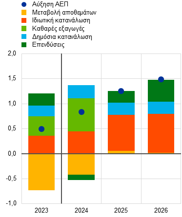 Μεσοπρόθεσμα, το πραγματικό ΑΕΠ αναμένεται να αυξηθεί με ρυθμούς παρόμοιους με τους ιστορικούς μέσους όρους, υποστηριζόμενο από την άνοδο των πραγματικών εισοδημάτων, την ενίσχυση της εξωτερικής ζήτησης και την εξασθένηση των ανασταλτικών επιδράσεων της νομισματικής πολιτικής. Η συνεχιζόμενη αύξηση του πραγματικού διαθέσιμου εισοδήματος αναμένεται να στηρίξει την ιδιωτική κατανάλωση, η οποία εκτιμάται ότι θα αποτελέσει τον κύριο προωθητικό παράγοντα της ανάπτυξης το β΄ εξάμηνο του 2024, αν και σε μικρότερο βαθμό από ό,τι προβλεπόταν στις προβολές του Ιουνίου. Οι δαπάνες των νοικοκυριών αναμένεται επίσης να επηρεαστούν θετικά από την ανθεκτική αγορά εργασίας, τη σταδιακή αύξηση της εμπιστοσύνης των καταναλωτών και τη μείωση της αβεβαιότητας, παρά τις επί του παρόντος προθέσεις για μεγαλύτερη αποταμίευση. Οι επιχειρηματικές επενδύσεις αναμένεται, βάσει των προβολών, να παραμείνουν υποτονικές βραχυπρόθεσμα, εν μέρει λόγω της αυξημένης πολιτικής αβεβαιότητας. Ωστόσο, στη συνέχεια αναμένεται ανάκαμψη, που αντανακλά τη φθίνουσα αλλά συνεχιζόμενη ανασταλτική επίδραση από την προηγηθείσα αυστηροποίηση της νομισματικής πολιτικής και τη στήριξη τόσο από την εγχώρια όσο και από την εξωτερική ζήτηση. Η αύξηση των εξαγωγών αναμένεται επίσης να ενισχυθεί από την εξωτερική ζήτηση. Οι επενδύσεις σε κατοικίες αναμένεται να συρρικνωθούν το 2024 και το 2025 αλλά στη συνέχεια να ανακάμψουν, ακολουθώντας παρόμοια πορεία με αυτήν στις προβολές του Ιουνίου. Η ομαλοποίηση του κύκλου των αποθεμάτων αναμένεται, βάσει των προβολών, να έχει σε γενικές γραμμές ουδέτερη συμβολή στην ανάπτυξη το β΄ εξάμηνο του 2024, έπειτα από σημαντική αρνητική συμβολή στην αλλαγή του έτους. Παρά την προβλεπόμενη αυστηροποίηση της κατεύθυνσης της δημοσιονομικής πολιτικής στη διάρκεια του χρονικού ορίζοντα προβολής, η δημόσια κατανάλωση και οι δημόσιες επενδύσεις αναμένεται να έχουν θετική συμβολή στην αύξηση του ΑΕΠ.