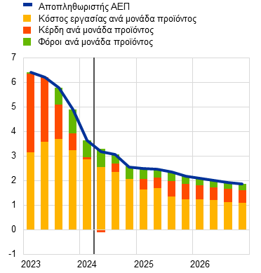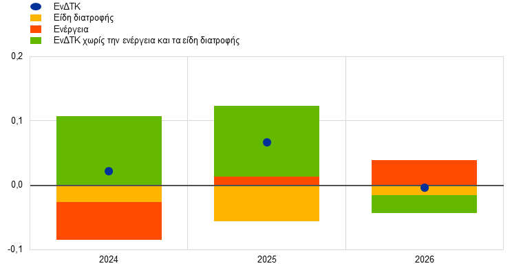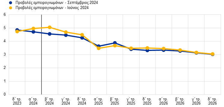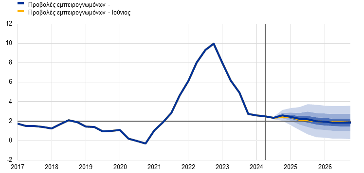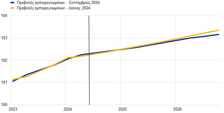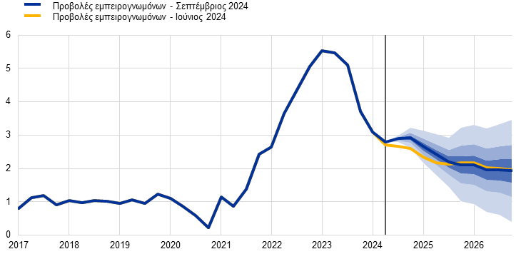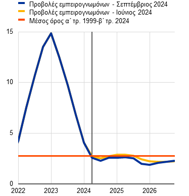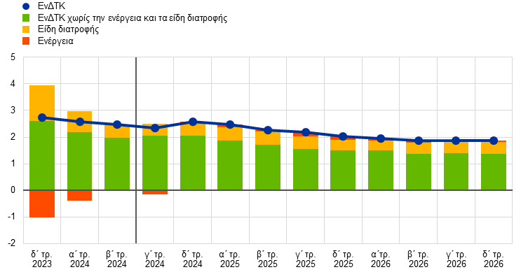 Μετά την πρόσφατη επιβράδυνσή του, ο γενικός πληθωρισμός αναμένεται, βάσει των προβολών, να αυξηθεί κάπως το τελευταίο τρίμηνο του τρέχοντος έτους και στη συνέχεια να υποχωρήσει περαιτέρω και να φθάσει στον στόχο για τον πληθωρισμό μέχρι το τέλος του 2025. Η αναμενόμενη άνοδος του πληθωρισμού βραχυπρόθεσμα αντανακλά σε μεγάλο βαθμό επιδράσεις βάσης από τις τιμές της ενέργειας. Μεσοπρόθεσμα, ο πληθωρισμός της ενέργειας αναμένεται να σταθεροποιηθεί σε χαμηλά θετικά επίπεδα, δεδομένων των προσδοκιών της αγοράς για τις διεθνείς τιμές και τις τιμές χονδρικής των ενεργειακών αγαθών, καθώς και των προγραμματισμένων δημοσιονομικών μέτρων που σχετίζονται με την κλιματική αλλαγή. Τα τελευταία τρίμηνα παρατηρήθηκε έντονη υποχώρηση του πληθωρισμού των ειδών διατροφής, καθώς οι πιέσεις σε προγενέστερα στάδια της αλυσίδας διαμόρφωσης των τιμών αμβλύνονται λόγω της μείωσης των διεθνών τιμών της ενέργειας και των τροφίμων. Ο πληθωρισμός των ειδών διατροφής δεν αναμένεται αρχικά να παραμείνει ουσιαστικά αμετάβλητος και στη συνέχεια να επιβραδυνθεί περαιτέρω από το τέλος του 2025 και μετά. Ο πληθωρισμός βάσει του ΕνΔΤΚ χωρίς τις τιμές της ενέργειας και των ειδών διατροφής (HICPX) αναμένεται να παραμείνει πάνω από το επίπεδο του γενικού πληθωρισμού για σχεδόν όλο τον χρονικό ορίζοντα προβολής, αλλά να συνεχίσει την πορεία αποκλιμάκωσής του. Ο πληθωρισμός των υπηρεσιών παρέμεινε επίμονα υψηλός τους τελευταίους μήνες. Ωστόσο, εξακολουθεί να αναμένεται σταδιακή υποχώρησή του σε μεταγενέστερο στάδιο του χρονικού ορίζοντα προβολής, καθώς οι πιέσεις από την πλευρά του μισθολογικού και λοιπού κόστους θα υποχωρούν, ενώ η προηγηθείσα αυστηροποίηση της νομισματικής πολιτικής, θα εξακολουθεί να μεταδίδεται με χρονική υστέρηση στις τιμές καταναλωτή. Τα τελευταία τρίμηνα ο ρυθμός αύξησης των ονομαστικών μισθών άρχισε να επιβραδύνεται από υψηλά επίπεδα και κατά περισσότερο από ό,τι προβλεπόταν προηγουμένως. Τα επόμενα έτη αναμένεται περαιτέρω σταδιακή υποχώρησή του, καθώς οι ανοδικές επιδράσεις από τις πιέσεις που συνδέονται με την αντιστάθμιση του πληθωρισμού υπό συνθήκες στενότητας στην αγορά εργασίας θα εξακολουθούν να εξασθενούν. Η ανάκαμψη του ρυθμού αύξησης της παραγωγικότητας αναμένεται να συμβάλει σε συγκράτηση των πιέσεων από την πλευρά του κόστους εργασίας. Επιπλέον, η αύξηση των κερδών έχει υποχωρήσει σημαντικά και θα απορροφήσει εν μέρει το αυξημένο κόστος εργασίας ώστε να μη μετακυλιστεί στις τιμές, ιδίως βραχυπρόθεσμα. Συνολικά, ο μέσος ετήσιος γενικός πληθωρισμός βάσει του ΕνΔΤΚ αναμένεται να μειωθεί από 5,4% το 2023 σε 2,5% το 2024, 2,2% το 2025 και 1,9% το 2026. Σε σύγκριση με τις προβολές των εμπειρογνωμόνων του Ιουνίου του 2024, οι προοπτικές για τον πληθωρισμό βάσει του ΕνΔΤΚ παραμένουν αμετάβλητες. Ο πληθωρισμός βάσει του HICPX ήταν τους τελευταίους μήνες ελαφρώς υψηλότερος από ό,τι αναμενόταν, οδηγώντας σε μικρές προς τα άνω αναθεωρήσεις το 2024 και το 2025.