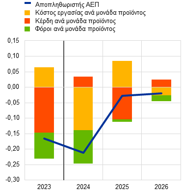 Οι εγχώριες πιέσεις στις τιμές, όπως μετρούνται από τον ρυθμό αύξησης του αποπληθωριστή του ΑΕΠ, προβλέπεται ότι θα συνεχίσουν να μειώνονται, καθώς η αύξηση των κερδών αρχικά αναμένεται να απορροφήσει εν μέρει τις υψηλές πιέσεις από πλευράς κόστους εργασίας και στη συνέχεια να ανακάμψει (Διάγραμμα 12). Ο ετήσιος ρυθμός αύξησης του αποπληθωριστή του ΑΕΠ υποχώρησε ραγδαία τα τελευταία τρίμηνα σε 3,2% το β΄ τρίμηνο του 2024.[11] Σύμφωνα με τις προβολές, θα συνεχίσει να μειώνεται σε όλη τη διάρκεια του 2024 και να διαμορφωθεί κατά μέσο όρο σε 3,1% το 2024 και στη συνέχεια να υποχωρήσει πιο σταδιακά σε 2,0% κατά μέσο όρο το 2026. Ο ρυθμός αύξησης των κερδών ανά μονάδα προϊόντος κορυφώθηκε στο τέλος του 2022 και έγινε αρνητικός το β΄ τρίμηνο του 2024.[12] Αναμένεται να παραμείνει κάτω από τον ρυθμό αύξησης του κόστους εργασίας ανά μονάδα προϊόντος σε όλη τη διάρκεια του 2024, γεγονός που σημαίνει ότι τα περιθώρια κέρδους θα απορροφούν τη σχετικά έντονη αύξηση του κόστους εργασίας. Καθώς η αύξηση του κόστους εργασίας ανά μονάδα προϊόντος θα μετριάζεται και η αύξηση του κόστους άλλων εισροών θα παραμένει επίσης συγκρατημένη, ο ρυθμός αύξησης των κερδών ανά μονάδα προϊόντος αναμένεται να ανακάμψει κάπως από το 2025 και μετά, υποβοηθούμενος από την οικονομική ανάκαμψη και την επιταχυνόμενη άνοδο της παραγωγικότητας. Σε σύγκριση με τις προβολές του Ιουνίου 2024, ο ρυθμός αύξησης του αποπληθωριστή του ΑΕΠ αναθεωρήθηκε προς τα κάτω για το 2024, αλλά παραμένει αμετάβλητος για το 2025 και το 2026. Τα κέρδη ανά μονάδα προϊόντος αναθεωρήθηκαν ελαφρώς προς τα πάνω για το 2024 και προς τα κάτω κατά 0,3 ποσ. μον. για το 2025, απορροφώντας την προς τα κάτω αναθεώρηση του κόστους εργασίας ανά μονάδα προϊόντος το 2024 και την οριακή προς τα άνω αναθεώρηση το 2025.
