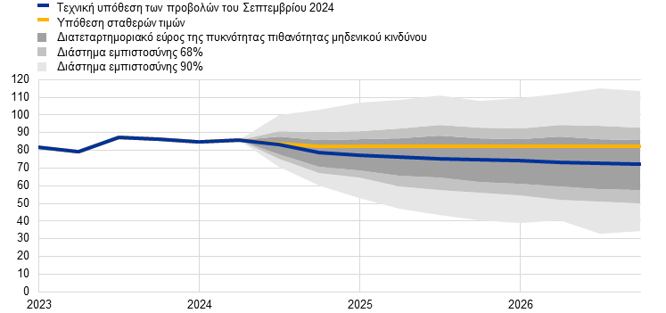 Σημειώσεις: Οι αναθεωρήσεις εκφράζονται ως ποσοστά (%) για τα επίπεδα και ως ποσοστιαίες μονάδες για τους ρυθμούς μεταβολής και τα ποσοστά ανά έτος. Οι αναθεωρήσεις των ρυθμών μεταβολής και των επιτοκίων υπολογίζονται με βάση αριθμητικά στοιχεία που έχουν στρογγυλοποιηθεί σε ένα δεκαδικό ψηφίο, ενώ οι αναθεωρήσεις που αναφέρονται ως ποσοστιαίες μεταβολές υπολογίζονται σε μη στρογγυλοποιημένα μεγέθη. Οι τεχνικές υποθέσεις που αφορούν τις τιμές των βασικών εμπορευμάτων και τα επιτόκια της ζώνης του ευρώ βασίζονται στις προσδοκίες της αγοράς σύμφωνα με στοιχεία έως και τις 16 Αυγούστου 2024. Οι τιμές του πετρελαίου αφορούν τις τιμές spot και προθεσμιακές (futures) του αργού πετρελαίου τύπου Brent. Οι τιμές του φυσικού αερίου αφορούν τις τιμές spot και προθεσμιακές του ολλανδικού χρηματιστηρίου ενέργειας (TTF). Οι τιμές της ηλεκτρικής ενέργειας αφορούν τη μέση τιμή χονδρικής spot και προθεσμιακή στις πέντε μεγαλύτερες χώρες της ζώνης του ευρώ. Η «σύνθετη» τιμή των συμβολαίων μελλοντικής εκπλήρωσης επί δικαιωμάτων εκπομπών στο πλαίσιο του Συστήματος Εμπορίας Δικαιωμάτων Εκπομπών της ΕΕ (ΣΕΔΕ) εκτιμάται ως η τιμή που καταγράφεται στο τέλος του μήνα (με γραμμική επέκταση της σειράς) στα δύο πλησιέστερα ευρωπαϊκά χρηματιστήρια ενέργειας (EUA futures). Στη συνέχεια, λαμβάνεται ο μέσος όρος των μηνιαίων τιμών των EUA futures ώστε να προκύψει ένα ισοδύναμο της ετήσιας συχνότητας. Η πορεία των τιμών των βασικών εμπορευμάτων προκύπτει από τις αγορές συμβολαίων μελλοντικής εκπλήρωσης κατά τις δέκα εργάσιμες ημέρες έως και την καταληκτική ημερομηνία. Βάσει των υποθέσεων, στον χρονικό ορίζοντα προβολής οι διμερείς συναλλαγματικές ισοτιμίες θα παραμείνουν αμετάβλητες στα μέσα επίπεδα που επικρατούσαν το διάστημα δέκα εργάσιμων ημερών που έληξε κατά την τελευταία ημερομηνία συμπερίληψης στοιχείων. Οι υποθέσεις για τις ονομαστικές αποδόσεις των 10ετών ομολόγων του Δημοσίου στη ζώνη του ευρώ βασίζονται στον μέσο όρο των αποδόσεων των 10ετών ομολόγων των χωρών, σταθμισμένο ως προς το ετήσιο ΑΕΠ. Όπου υπάρχουν τα απαραίτητα στοιχεία, οι ονομαστικές αποδόσεις των 10ετών ομολόγων του Δημοσίου ανά χώρα ορίζονται ως οι αποδόσεις των 10ετών ομολόγων αναφοράς με επέκταση της σειράς με βάση την προβλεπόμενη εξέλιξη της καμπύλης αποδόσεων κατά την έκδοση που προκύπτει, κατά την καταληκτική ημερομηνία, από τις αντίστοιχες καμπύλες αποδόσεων για τις επιμέρους χώρες. Για τις υπόλοιπες χώρες, οι αποδόσεις των 10ετών ομολόγων του Δημοσίου ανά χώρα ορίζονται ως η απόδοση των 10ετών ομολόγων αναφοράς με επέκταση της σειράς με βάση την τεχνική υπόθεση για τα μακροπρόθεσμα επιτόκια μηδενικού κινδύνου της ζώνης του ευρώ συν ένα σταθερό περιθώριο (παρατηρούμενο κατά την καταληκτική ημερομηνία).