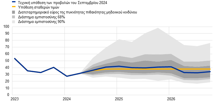 Σημείωση: Οι πυκνότητες πιθανότητας με βάση τα δικαιώματα προαίρεσης για τις τιμές του φυσικού αερίου και του πετρελαίου προκύπτουν από τις τιμές της αγοράς της 16ης Αυγούστου 2024 για τα δικαιώματα προαίρεσης επί των συμβολαίων μελλοντικής εκπλήρωσης ICE Brent και Dutch TTF Natural Gas με καθορισμένες τριμηνιαίες ημερομηνίες λήξης.