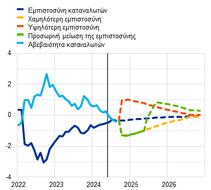 Σημειώσεις: Στο γράφημα (β) τα στοιχεία είναι τυποποιημένα για το σύνολο του διαθέσιμου δείγματος –από τον Ιανουάριο του 1999 έως τον Αύγουστο του 2024 για την εμπιστοσύνη και από τον Απρίλιο του 2019 έως τον Ιούλιο του 2024 για την αβεβαιότητα. Η διακεκομμένη μπλε γραμμή αναφέρεται σε μια προβολή της εμπιστοσύνης των καταναλωτών η οποία είναι συμβατή με τις προβολές του βασικού σεναρίου με βάση το εμπειρικό υπόδειγμα που περιγράφεται στο Διάγραμμα Β. Οι εναλλακτικές πορείες της εμπιστοσύνης των καταναλωτών, όπως απεικονίζονται στο διάγραμμα, περιγράφονται παρακάτω. Στο γράφημα β) η κάθετη γραμμή αντιστοιχεί στην έναρξη του τρέχοντος χρονικού ορίζοντα προβολής. Οι πιο πρόσφατες παρατηρήσεις αφορούν το α΄ ́ τρίμηνο 2024 στο γράφημα α) και τον Αύγουστο 2024 στο γράφημα β).