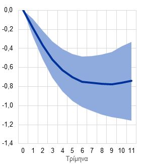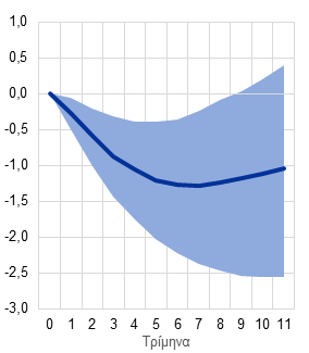 Σημειώσεις: Το υπόδειγμα εκτιμάται με βάση στοιχεία για τη ζώνη του ευρώ μεταξύ του α΄ τριμήνου του 1999 και του δ΄ τριμήνου του 2019 για την εμπιστοσύνη των καταναλωτών, την ιδιωτική κατανάλωση, τις επενδύσεις σε κατοικίες, το επιτόκιο, το πραγματικό διαθέσιμο εισόδημα και τον αποπληθωριστή της ιδιωτικής κατανάλωσης. Το επιτόκιο υπολογίζεται ως μέσος όρος των βραχυπρόθεσμων και μακροπρόθεσμων επιτοκίων των τίτλων του του Δημοσίου. Οι μεταβλητές εισάγονται στο υπόδειγμα σε λογαριθμική μορφή, με εξαίρεση το επιτόκιο. Το υπόδειγμα εκτιμάται χρησιμοποιώντας στοιχεία με υστέρηση τεσσάρων τριμήνων. Στο πλαίσιο ταυτοποίησης κατά Cholesky που χρησιμοποιείται, ο αποπληθωριστής της ιδιωτικής κατανάλωσης κατατάσσεται πρώτος και ακολουθεί το πραγματικό διαθέσιμο εισόδημα, η ιδιωτική κατανάλωση, οι επενδύσεις σε κατοικίες, τα επιτόκια και η εμπιστοσύνη των καταναλωτών. Οι επιδράσεις που παρουσιάζονται στο διάγραμμα έχουν κανονικοποιηθεί σε μια διαταραχή της εμπιστοσύνης των καταναλωτών κατά μία τυπική απόκλιση. Οι μπλε περιοχές αντιπροσωπεύουν διαστήματα εμπιστοσύνης 68%. Οι επιδράσεις στο ποσοστό αποταμίευσης υπολογίζονται σύμφωνα με τις εκτιμώμενες βάσει του υποδείγματος επιδράσεις των διαταραχών της εμπιστοσύνης στο πραγματικό διαθέσιμο εισόδημα και στην πραγματική ιδιωτική κατανάλωση. Οι εκτιμήσεις για την πορεία του ποσοστού αποταμίευσης παρουσιάζονται στο Διάγραμμα Γ.