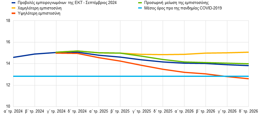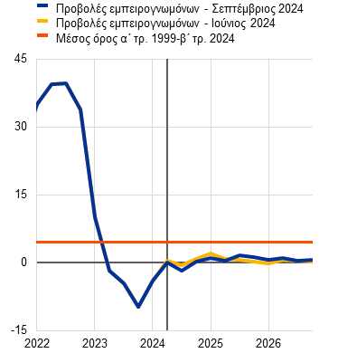 Ο ρυθμός αύξησης του πραγματικού ΑΕΠ αναμένεται να επιβραδυνθεί το β΄ εξάμηνο του 2024 σε επίπεδα χαμηλότερα από ό,τι είχε προβλεφθεί στις προβολές του Ιουνίου. Οι πιο υποτονικές προοπτικές αντανακλούν το ακόμη χαμηλό επίπεδο των δεικτών ερευνών για τη δραστηριότητα, όπως ο Δείκτης Υπευθύνων Προμηθειών (PMI) και οι δείκτες εμπιστοσύνης των επιχειρήσεων και των καταναλωτών από έρευνες της Ευρωπαϊκής Επιτροπής. Η εξασθένηση του μεταποιητικού τομέα ήταν ιδιαίτερα έντονη – ο δείκτης PMI για την παραγωγή στον τομέα της μεταποίησης ήταν 45,8 τον Αύγουστο. Συνδέεται κυρίως με την υποτονική ζήτηση, με τη Γερμανία να είναι η χώρα που πλήττεται περισσότερο. Παράλληλα, η δραστηριότητα στον τομέα των υπηρεσιών – η οποία εν μέρει ενισχύθηκε πρόσκαιρα από τους Ολυμπιακούς Αγώνες που πραγματοποιήθηκαν στο Παρίσι – φαίνεται να αυξάνεται με ικανοποιητικό ρυθμό, όπως αντανακλάται στον δείκτη PMI για τις υπηρεσίες ο οποίος διαμορφώθηκε σε 52,9 τον Αύγουστο. Το συνολικό πραγματικό ΑΕΠ αναμένεται να αυξηθεί κατά 0,2% το γ΄ και το δ΄ τρίμηνο, και στις δύο περιπτώσεις κατά 0,2 της ποσοστιαίας μονάδας (ποσ. μον.) χαμηλότερα σε σχέση με τις προβολές του Ιουνίου.
