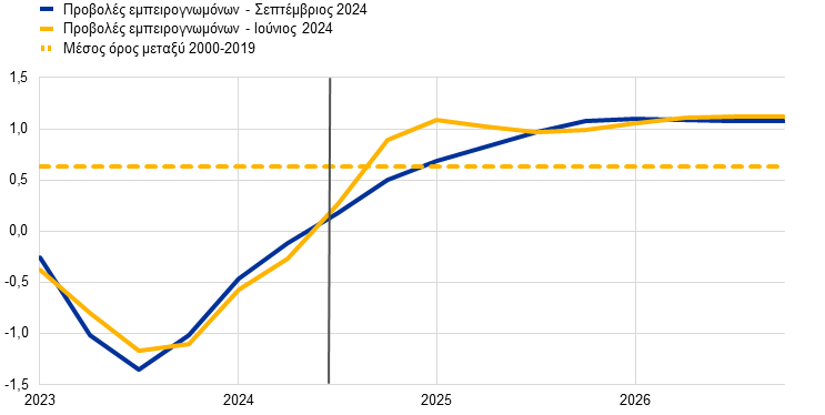 Πηγές: Προβλέψεις της Consensus Economics, 15 Αυγούστου 2024 (τα στοιχεία για το 2026 προέρχονται από την έρευνα του Ιουλίου 2024)· Έρευνα της ΕΚΤ μεταξύ των Επαγγελματικών Φορέων Διενέργειας Προβλέψεων, 19 Ιουλίου 2024· ΔΝΤ, World Economic Outlook, 16 Ιουλίου 2024· Οικονομικές Προβλέψεις της Ευρωπαϊκής Επιτροπής, Άνοιξη 2024, 15 Μαΐου 2024· ΟΟΣΑ, Economic Outlook, 2 Μαΐου 2024.