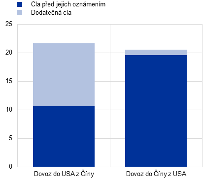 Cla zahrnutá do základních projekcí z března 2025 zahrnují první soubor dvoustranných cel mezi Spojenými státy a Čínou. Spojené státy oznámily 1. února 2025 oznámily dodatečné clo ve výši 10 procentních bodů na veškeré čínské zboží, což představuje významný krok v probíhajícím obchodním sporu (graf, panel a). Jako odvetná opatření Čína zavedla cla na 80 produktů z USA, včetně zkapalněného zemního plynu (dále též „LNG“), uhlí a zemědělských zařízení, čímž ve skutečnosti zvýšila celkovou efektivní celní sazbu na dovoz z USA o 1 procentní bod. Kromě toho Čína zavedla zákazy vývozu kriticky důležitých kovů, jako je telurium a wolfram. Zatímco americká cla se vztahují na veškeré čínské zboží, které představuje 13 % dovozu do USA, čínská odvetná cla jsou cílenější a ovlivňují pouze 1 % čínského dovozu. Díky těmto opatřením však byly celkové efektivní celní sazby mezi oběma zeměmi víceméně podobné.