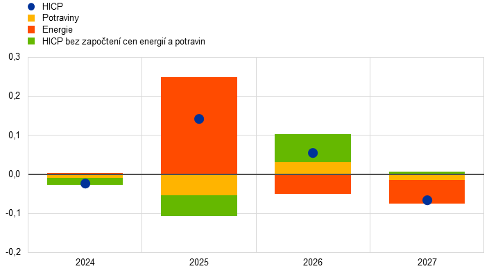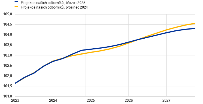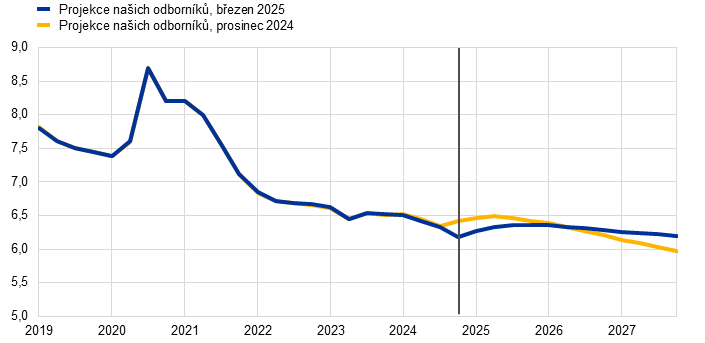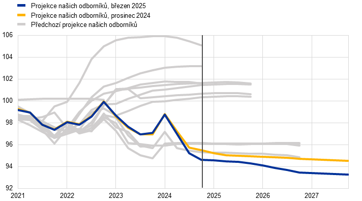 Celková inflace měřená HICP se v posledních měsících zvýšila, ale předpokládá se, že v průběhu roku 2025 nepatrně zmírní a poté od prvního čtvrtletí roku 2026 poklesne a bude se pohybovat kolem inflačního cíle ECB na úrovni 2,0 %. Na začátku horizontu projekcí by vlivy srovnávací základny ve složce energií a vyšší růst cen potravin měly víceméně vyrovnat tlumící dopady poklesu inflace měřené HICP bez započtení cen energií a potravin (dále též „HICPX“). Nárůst cen energetických komodit na přelomu roku se promítne do meziroční změny cen energií v roce 2025. I když by ceny ropy a plynu měly v souladu s cenami futures klesat, je pravděpodobné, že růst cen energií bude po celý horizont projekcí nadále vykazovat kladné hodnoty, i když pod historickým průměrem. Očekává se, že v roce 2027 bude růst cen energií způsoben zavedením nových opatření ke zmírnění změny klimatu. Předpokládá se, že inflace ve složce potravin poroste až do poloviny roku 2025, a to především v důsledku nedávného výrazného růstu cen potravinářských komodit, a poté klesne a v roce 2027 dosáhne v průměru 2,2 %. Inflace měřená HICPX by měla počátkem roku 2025 začít klesat s tím, jak budou odeznívat dopady opožděného přeceňování, ustupovat mzdové tlaky a dopad dřívějšího zpřísnění měnové politiky se bude nadále promítat do spotřebitelských cen. Hlavním faktorem tohoto poklesu by mělo být snížení růstu cen služeb, který je zatím poměrně setrvalý. Celkově by podle projekcí měla inflace měřená HICPX zpomalit z 2,2 % v roce 2025 na 1,9 % v roce 2027. Růst mezd by měl ze současné stále zvýšené úrovně pokračovat v sestupné tendenci s tím, jak odeznívají tlaky spojené s inflační kompenzací. Ve spojení s očekávaným oživením růstu produktivity by to mělo vést k výrazně pomalejšímu růstu jednotkových nákladů práce. V důsledku toho by měly domácí cenové tlaky nadále polevovat a ziskové marže by se měly v horizontu projekcí zotavovat. Vnější cenové tlaky, které se odrážejí v dovozních cenách, by měly zůstat mírné za předpokladu, že politiky EU v oblasti obchodních cel zůstanou beze změny. V porovnání s projekcemi z prosince 2024 byl výhled celkové inflace měřené HICP pro rok 2025 revidován o 0,2 procentního bodu směrem nahoru z důvodu předpokladů vyšších cen energetických komodit a oslabení eura, zatímco pro rok 2027 byl revidován nepatrně směrem dolů v důsledku mírně slabšího výhledu ve složce energií na konci horizontu projekcí.