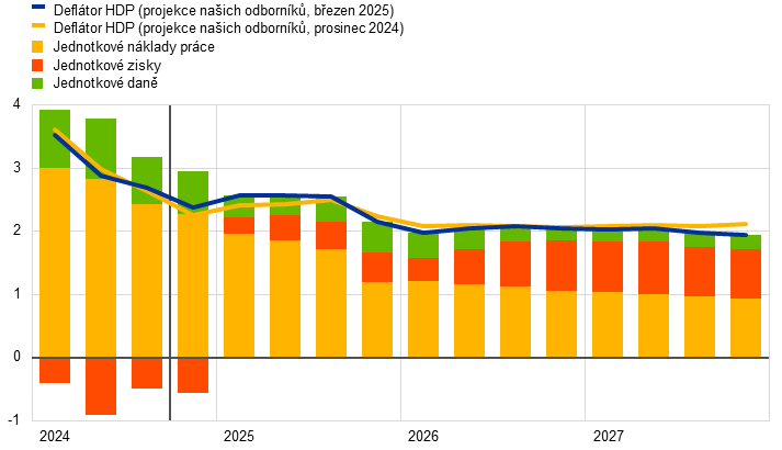 Růst jednotkových nákladů práce by měl v letech 2026 a 2027 klesat, čemuž napomůže jednak snižující se růst mezd a jednak posilující tempo růstu produktivity. Odhaduje se, že růst jednotkových nákladů práce ve čtvrtém čtvrtletí roku 2024 činil 4,1 % a do roku 2027 by měl klesnout na průměrných 1,7 %, což je v souladu s historickým průměrem. V porovnání s projekcemi z prosince 2024 byl růst jednotkových nákladů práce pro rok 2025 revidován o 0,4 procentního bodu směrem nahoru, a to především v důsledku nižšího růstu produktivity, a pro rok 2027 o 0,3 procentního bodu směrem dolů, a to především v důsledku revizí růstu náhrad na zaměstnance směrem dolů.
