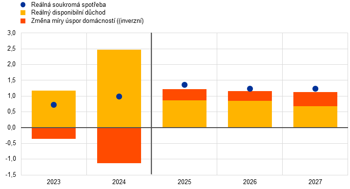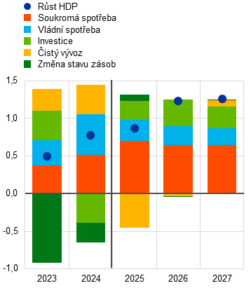 Ve střednědobém horizontu by měl růst reálného HDP posilovat. Podporovat by jej měl růst spotřeby, zlepšující se investice a zahraniční poptávka a odeznívání tlumících účinků dřívějšího zpřísnění měnové politiky (tabulka 3). Růst soukromé spotřeby by mělo podpořit probíhající posilování kupní síly domácností v důsledku odolného růstu mezd a zaměstnanosti a klesající inflace. Očekává se, že výdaje domácností budou ve střednědobém horizontu nadále podporovat oživení, k čemuž přispěje také pokles míry úspor domácností ze současné stále zvýšené úrovně. Růst soukromé spotřeby by měl být podpořen také odolným, i když oslabujícím trhem práce a předpokládaným postupným oživením spotřebitelské důvěry. Investice by měly v horizontu projekcí postupně posilovat, a to především v důsledku odeznívání vlivu předchozího zpřísňování měnové politiky, ale také podpory ze strany rostoucích zisků, využívání finančních prostředků v rámci programu Next Generation EU (dále též „NGEU“) a zlepšení domácí i zahraniční poptávky. Zahraniční poptávka by měla podpořit také růst vývozu, avšak nejistota související s obchodní politikou spolu s přetrvávajícími otázkami konkurenceschopnosti eurozóny naznačuje pokračující ztrátu podílů na vývozních trzích. Odhaduje se, že probíhající ukončování diskrečních fiskálních podpůrných opatření zavedených v reakci na pandemii a energetickou krizi bude mít v letech 2025–2027 i nadále malý negativní dopad na růst HDP.