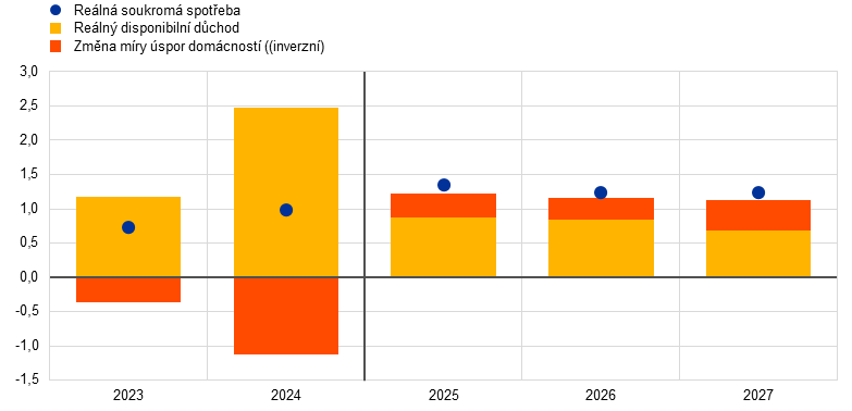 Výhled hospodářského růstu eurozóny je zastřen obchodním napětím a zvýšenou mírou nejistoty ve světě. Pro rok 2025 jako celek jsou tyto vlivy částečně vyrovnány silnější hospodářskou aktivitou v prvním čtvrtletí oproti očekáváním, což pravděpodobně odráží předzásobení dovozu v očekávání vyšších cel. Ve střednědobém horizontu by hospodářskou aktivitu měla podporovat nedávno oznámená nová fiskální opatření. Podle základní projekce by americká cla na zboží z EU, která byla zvýšena na 10 %, měla zůstat v platnosti po celý horizont projekcí. Společně se zvýšenou mírou nejistoty spojenou s obchodní politikou a nedávným zhodnocením eura budou vyšší cla tlumit vývoz z eurozóny a investice a v menším rozsahu spotřebu. Naopak nové vládní výdaje na infrastrukturu a obranu zejména v Německu by měly od roku 2026 podpořit domácí poptávku v eurozóně. Celkově přetrvávají podmínky pro to, aby růst HDP v eurozóně v horizontu projekcí posílil. Postupné hospodářské oživení by měly podpořit zejména rostoucí reálné mzdy a zaměstnanost, méně restriktivní podmínky financování, které odrážejí především nedávná měnověpolitická rozhodnutí, a zotavení zahraniční poptávky později ve sledovaném období. Průměrné meziroční tempo růstu reálného HDP by mělo dosáhnout hodnoty 0,9 % v roce 2025, 1,1 % v roce 2026 a 1,3 % v roce 2027. V porovnání s makroekonomickými projekcemi z března 2025, které sestavili odborníci ECB, zůstává výhled růstu HDP pro rok 2025 beze změny, což oproti očekáváním odráží lepší aktuální data, u nichž se předpokládá, že budou do značné míry kompenzována vlivem napětí v obchodních vztazích a posilováním směnného kurzu eura. Obchodní napětí a silnější směnný kurz vedly k revizi růstu pro rok 2026 směrem dolů, zatímco růst pro rok 2027 zůstal nezměněn.[1]