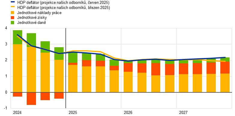 Zatímco celková inflace měřená harmonizovaným indexem spotřebitelských cen (HICP) pravděpodobně zůstane v blízké budoucnosti pod 2 %, očekává se, že se ve střednědobém horizontu vrátí k cíli. Předpokládá se, že inflace během roku 2025 klesne, v prvním čtvrtletí roku 2026 dosáhne nejnižší hodnoty 1,4 % a v roce 2027 se vrátí na 2,0 %. Pokles celkové inflace v roce 2025 by měl být částečně způsoben záporným růstem cen energií v důsledku nedávného poklesu cen ropy a velkoobchodních cen zemního plynu. Očekává se, že růst cen energií zůstane negativní až do roku 2027, kdy v souvislosti s novým systémem obchodování s emisemi (ETS2) vstoupí v platnost nová opatření ke zmírnění změny klimatu. Po dočasném nárůstu ve druhém čtvrtletí roku 2025 se očekává, že růst cen potravin v roce 2027 klesne na úroveň mírně nad 2 %. Inflace měřená HICP bez započtení energií a potravin (HICPX) by měla klesat v důsledku vývoje složky služeb, neboť dopady opožděných cenových úprav u některých položek odezní, mzdové tlaky ustupují a nižší ceny energií se promítají do cenového řetězce. Růst mezd by měl nadále klesat s tím, jak slábnou tlaky na vyrovnání minulých ztrát reálné mzdy. Spolu s oživením růstu produktivity by to mělo vést k výrazně pomalejšímu růstu jednotkových mzdových nákladů. Vnější cenové tlaky, které se promítají do dovozních cen, by měly zůstat mírné za předpokladu, že celní politika EU zůstane beze změny, přičemž určitý tlak na pokles by měl být způsoben silnějším eurem a poklesem cen energetických komodit v posledních měsících. V porovnání s projekcemi z března 2025 je výhled celkové inflace měřené HICP revidován směrem dolů pro rok 2025 i 2026 o 0,3 procentního bodu z důvodu předpokladu nižších cen energetických komodit a posílení eura, zatímco pro rok 2027 zůstává beze změny.