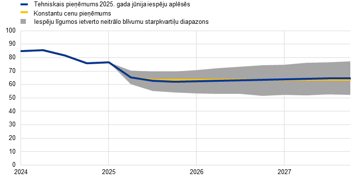 Piezīmes. Līmeņu korekcijas izsaka procentos un pieauguma tempa un gada procentuālo rādītāju korekcijas – procentu punktos. Izaugsmes tempa un procentu likmju korekcijas aprēķina, izmantojot skaitļus, kas noapaļoti līdz vienam ciparam aiz komata, savukārt korekcijas, kas uzrādītas kā procentuālās pārmaiņas, aprēķina, izmantojot nenoapaļotus skaitļus. Tehniskie pieņēmumi par eurozonas procentu likmēm un izejvielu cenām balstīti uz tirgus gaidām atbilstoši stāvoklim 2025. gada 14. maijā. Naftas cenas ir Brent jēlnaftas tagadnes darījumu cenas un biržā tirgoto nākotnes līgumu cenas. Gāzes cenas ir Nīderlandes biržas gāzes tagadnes darījumu cenas un biržā tirgoto nākotnes līgumu cenas. Elektroenerģijas cenas ir piecu lielāko eurozonas valstu vidējās vairumtirdzniecības tagadnes darījumu cenas un biržā tirgoto nākotnes līgumu cenas. ETS1 kvotu (EUA) "sintētiskā" biržā tirgoto nākotnes līgumu cena atvasināta kā divu tuvāko Eiropas Enerģijas biržas EUA nākotnes līgumu lineāri interpolētā vērtība mēneša beigās. Pēc tam tiek noteiktas EUA biržā tirgoto nākotnes līgumu mēneša vidējās cenas, lai iegūtu gada rādītāja ekvivalentu. Tā kā ETS2 kvotas netiek tirgotas, Eurosistēmas speciālistu pieņēmumus par šīm cenām veido robežcena, virs kuras tiks atbrīvotas papildu kvotas, un šī cena aktualizēta atbilstoši 2027. gada cenām (sīkāku informāciju sk. Eurosistēmas speciālistu 2024. gada decembra iespēju aplēšu pārskata ielikumā "Novērtējums par klimata pārmaiņu pārkārtošanās politikas ietekmi uz izaugsmi un inflāciju"). Uz izejvielu cenu tendencēm norāda biržā tirgoto nākotnes darījumu tirgi 10 darbadienu laikā pirms pēdējā datu aktualizēšanas termiņa. Pieņemts, ka divpusējie valūtu kursi iespēju aplēšu periodā nemainīsies salīdzinājumā ar vidējiem rādītājiem, kuri dominēja 10 darbadienu periodā, kas beidzās pēdējā datu aktualizēšanas dienā. Pieņēmumi par eurozonas valstu valdības 10 gadu obligāciju nominālajām ienesīguma likmēm balstās uz valstu 10 gadu obligāciju vidējām ienesīguma likmēm, kas svērtas ar IKP gada rādītājiem. Ja pieejami nepieciešamie dati, konkrētu valstu valdības 10 gadu obligāciju nominālās ienesīguma likmes definē kā 10 gadu etalonobligāciju ienesīguma likmes, ko pielāgo, izmantojot biržā netirgoto nākotnes līgumu nominālās ienesīguma likmes, kas pēdējā datu aktualizēšanas termiņā iegūtas no atbilstošajām attiecīgo valstu ienesīguma līknēm. Pārējām valstīm attiecīgās valsts 10 gadu obligāciju ienesīguma likmes definē kā 10 gadu etalonobligāciju ienesīguma likmi, ko attiecina uz garāku periodu, izmantojot nemainīgu starpību (kas novērota pēdējā datu aktualizēšanas termiņā) ar tehnisko pieņēmumu par eurozonas bezriska ilgtermiņa procentu likmi.