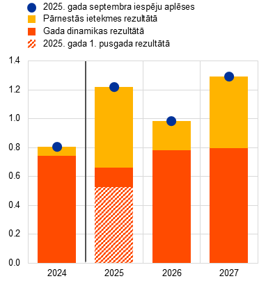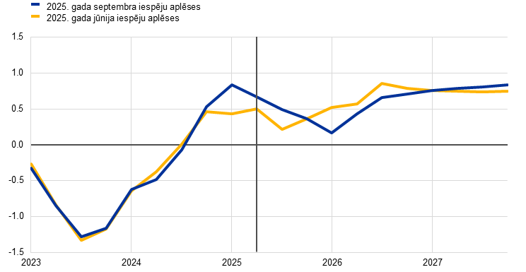 Tirdzniecības tarifi un ar tiem saistītā nenoteiktība 2025. gada 1. pusgadā veicināja spēcīgas ekonomiskās aktivitātes svārstības, kas skaidrojamas ar darījumu priekšpiegādi, īpaši Īrijā. Gaidāms, ka, šiem faktoriem izzūdot, 2. pusgadā būs vērojamas turpmākas svārstības, tāpēc signāli par eurozonas tautsaimniecības izaugsmes pamattempu būs neskaidri. Neņemot vērā Īrijas datu svārstību radīto svārstīgumu, tautsaimniecības izaugsme pārējā eurozonā faktiski bijusi stabilāka, un līdzīga aina gaidāma arī 2. pusgadā. Lai gan jaunā ASV un ES tirdzniecības vienošanās paredz augstākus tarifus eurozonas eksportam uz ASV, tā palīdzējusi mazināt ar tirdzniecības politiku saistīto nenoteiktību. Paredzams, ka vēlāk iespēju aplēšu periodā eurozonas tautsaimniecības izaugsme kļūs spēcīgāka, un to veicinās vairāki faktori. Reālās darba samaksas un nodarbinātības kāpumam, kā arī jaunajiem valdības izdevumiem infrastruktūrai un aizsardzībai (galvenokārt Vācijā) vajadzētu veicināt eurozonas iekšzemes pieprasījumu. Turklāt tiek uzskatīts, ka izaugsmes perspektīvu veicinās arī mazāk ierobežojoši finansēšanas nosacījumi, galvenokārt atspoguļojot nesenos monetārās politikas lēmumus, un ārējā pieprasījuma atjaunošanās 2027. gadā. Paredzams, ka gada vidējais reālā IKP pieauguma temps 2025. gadā būs 1.2 %, 2026. gadā – 1.0 % un 2027. gadā – 1.3 %. Salīdzinājumā ar Eurosistēmas speciālistu 2025. gada jūnija makroekonomiskajām iespēju aplēsēm IKP pieauguma perspektīva 2025. gadam koriģēta un paaugstināta par 0.3 procentu punktiem, atspoguļojot labākus, nekā gaidīts, saņemtos datus un vēsturisko datu korekciju pārnesto ietekmi. Tā kā ne visi ar datiem saistītie pārsteigumi attiecas uz spēcīgāku, nekā iepriekš tika pieņemts, darījumu priekšpiegādi, tiek uzskatīts, ka 2. pusgadā tie tiks tikai daļēji kompensēti. Sakarā ar euro kursa kāpumu un vājāku ārējo pieprasījumu (kas daļēji saistīts ar nedaudz augstākiem tarifiem, nekā tika pieņemts jūnija iespēju aplēsēs) 2026. gadā veikta lejupvērsta korekcija par 0.1 procentu punktu. Iespēju aplēse 2027. gadam nav mainījusies.[1]