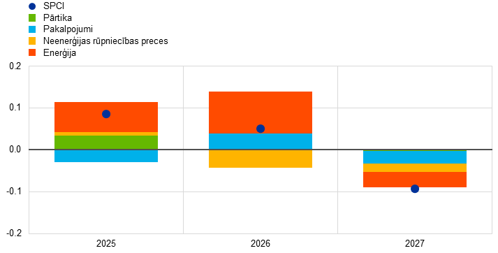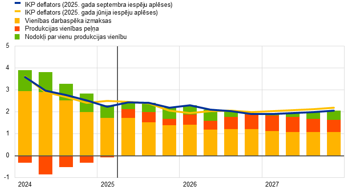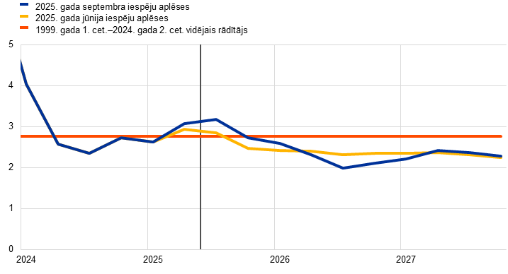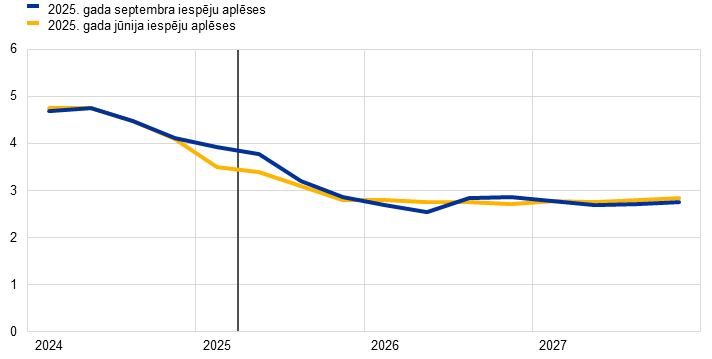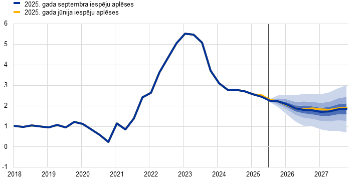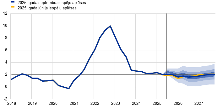 Inflācijas perspektīva ir saskaņā ar inflācijas stabilizēšanos aptuveni 2 % vidējā termiņa mērķa līmenī. Paredzams, ka kopējā inflācija, ko mēra ar saskaņoto patēriņa cenu indeksu (SPCI), atlikušajos 2025. gada mēnešos virzīsies horizontāli aptuveni 2 % līmenī un pēc tam 2026. gadā saruks līdz 1.7 %, bet pēc tam 2027. gadā atkal pieaugs līdz 1.9 %. Kritums 2026. gadā atspoguļo turpmāku pakāpenisku neenerģijas komponentu sarukumu, savukārt enerģijas cenu inflācija arī turpmāk būs svārstīga, bet iespēju aplēšu periodā pieaugs, daļēji tāpēc, ka 2027. gadā sāks darboties otrā ES emisijas kvotu tirdzniecības sistēma (ETS2). Gaidāms, ka pārtikas cenu inflācija sākotnēji saglabāsies paaugstināta sakarā ar starptautisko pārtikas izejvielu cenu agrākā kāpuma novēloto ietekmi, bet 2026. un 2027. gadā kāpuma temps kļūs lēnāks (nedaudz virs 2 %). Gaidāms, ka SPCI inflācija (neietverot enerģijas un pārtikas cenas; SPCIX) pazemināsies, mazinoties darba samaksas spiedienam un pakalpojumu cenu inflācijai kļūstot mērenākai un euro kursa kāpumam atspoguļojoties dažādos cenu noteikšanas posmos un ierobežojot preču cenu inflāciju. Gaidāms, ka darba samaksas pieauguma kritums pēc tam, kad būs atgūti agrākie reālās darba samaksas zaudējumi, kopā ar darba ražīguma pieauguma atjaunošanos noteiks būtiski lēnāku vienības darbaspēka izmaksu pieaugumu. Salīdzinājumā ar 2025. gada jūnija iespēju aplēsēm kopējās SPCI inflācijas perspektīva gan 2025., gan 2026. gadam koriģēta un paaugstināta par 0.1 procentu punktu sakarā ar augstākiem enerģijas izejvielu cenu rezultātiem un pieņēmumiem, kā arī augstāku starptautisko pārtikas izejvielu cenu novēloto ietekmi, kas ar uzviju kompensē euro kursa kāpumu. Tiek uzskatīts, ka 2027. gadā euro kursa kāpuma novēlotā ietekme dominēs, tāpēc attiecīgi veikta lejupvērsta korekcija par 0.1 procentu punktu.